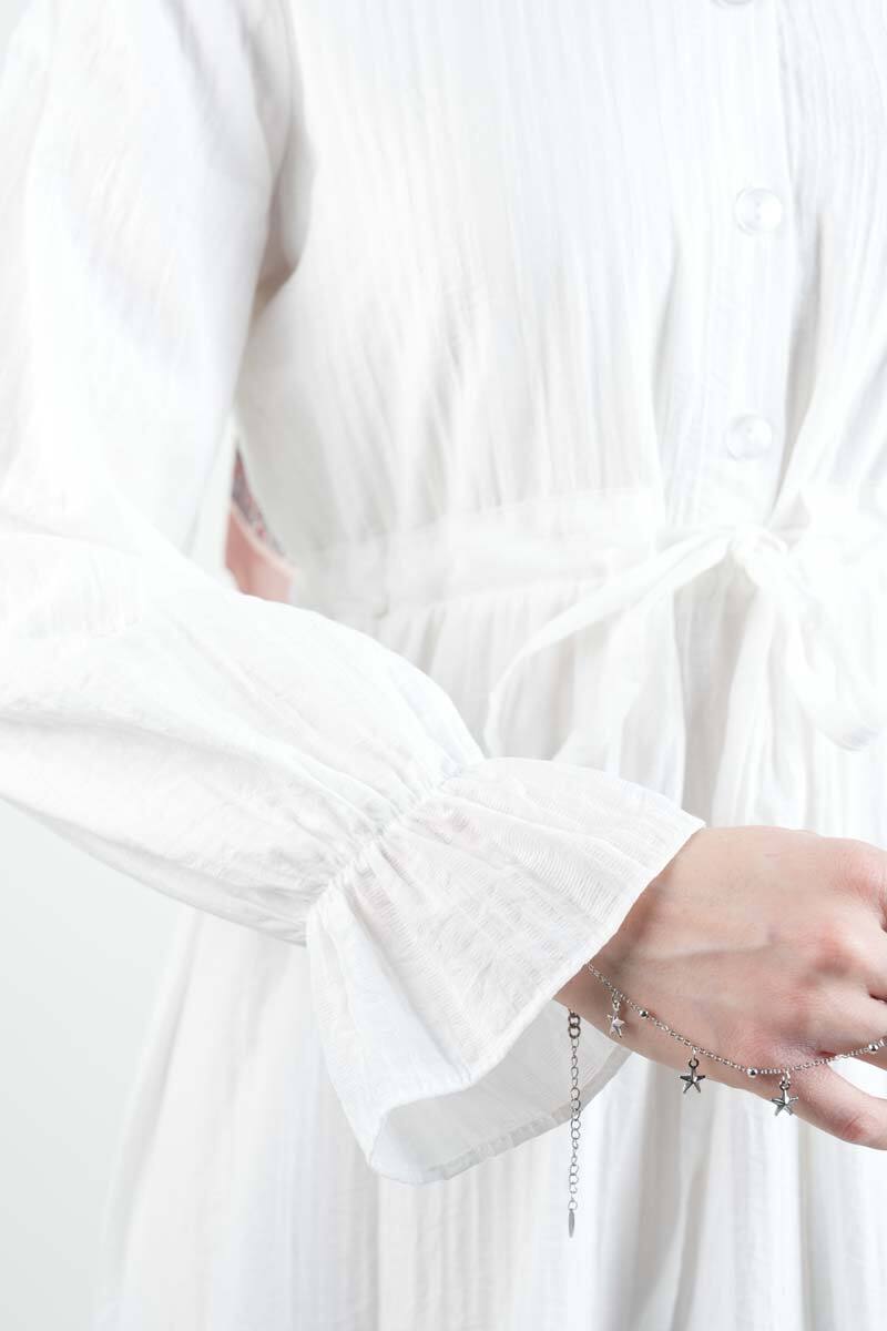 Tesettür Elbise Yarım Düğmeli Kol Fırfırlı Prenses Elbise Beyaz