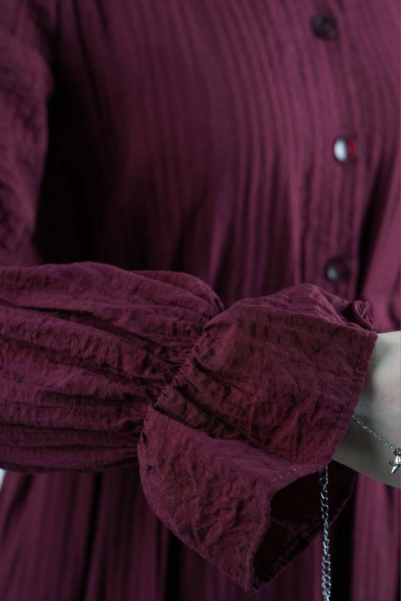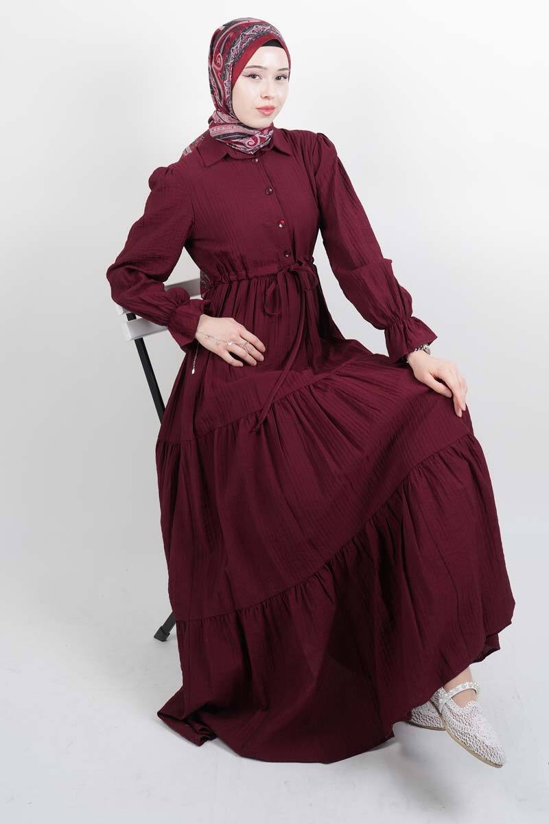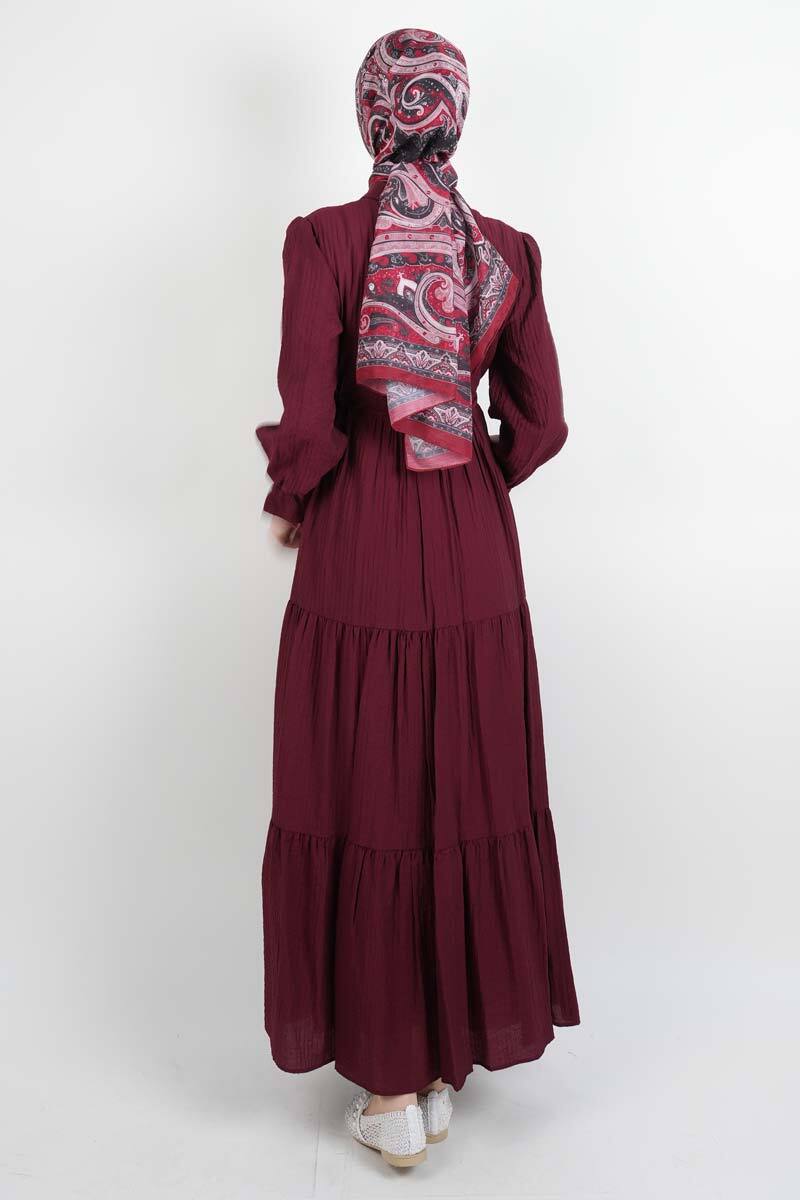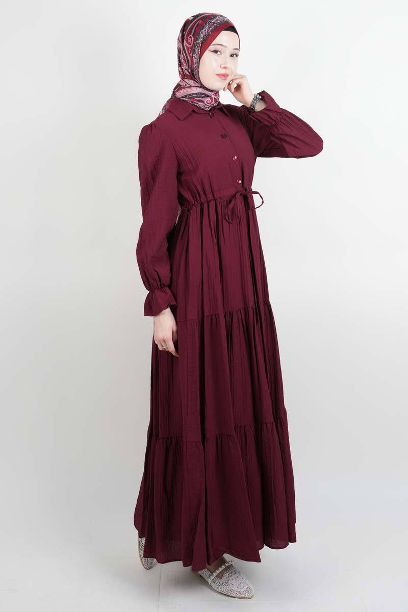 Tesettür Elbise Yarım Düğmeli Kol Fırfırlı Prenses Elbise Bordo