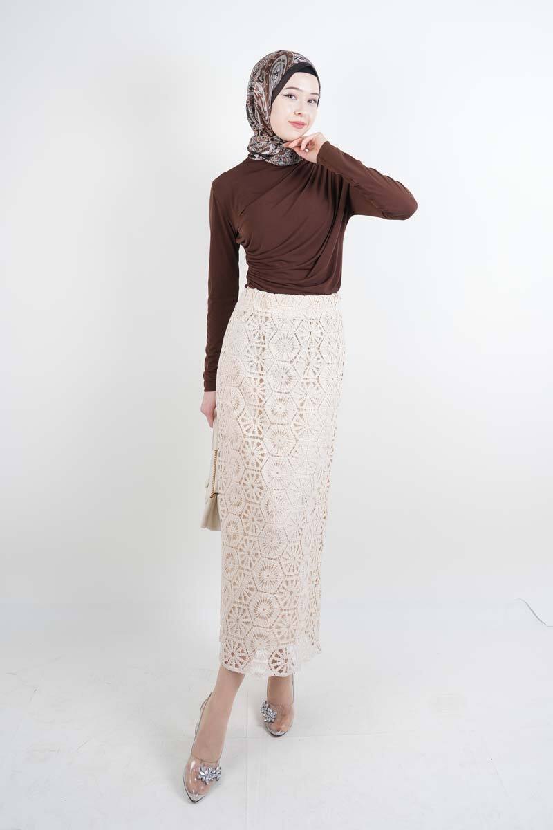 Yeni sezon dantelli kalem etek, vücudu saran modern kalıbı ve etek ucundaki zarif dantel detayıyla şıklık sunar. Esnek kumaşıyla konforludur, özel günler ve günlük kullanım için idealdir.