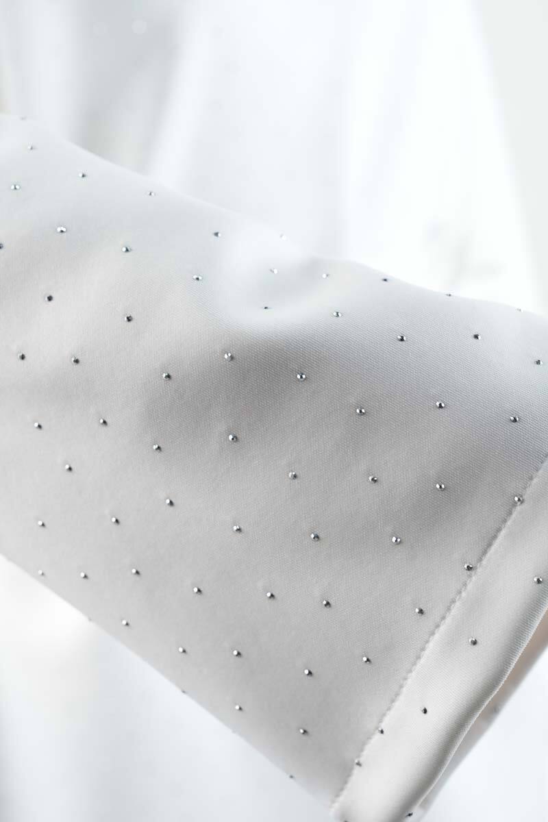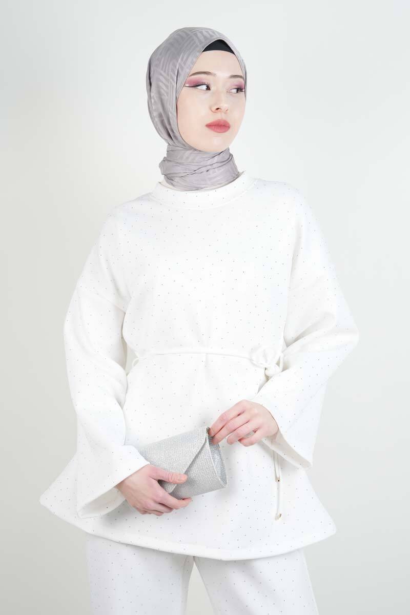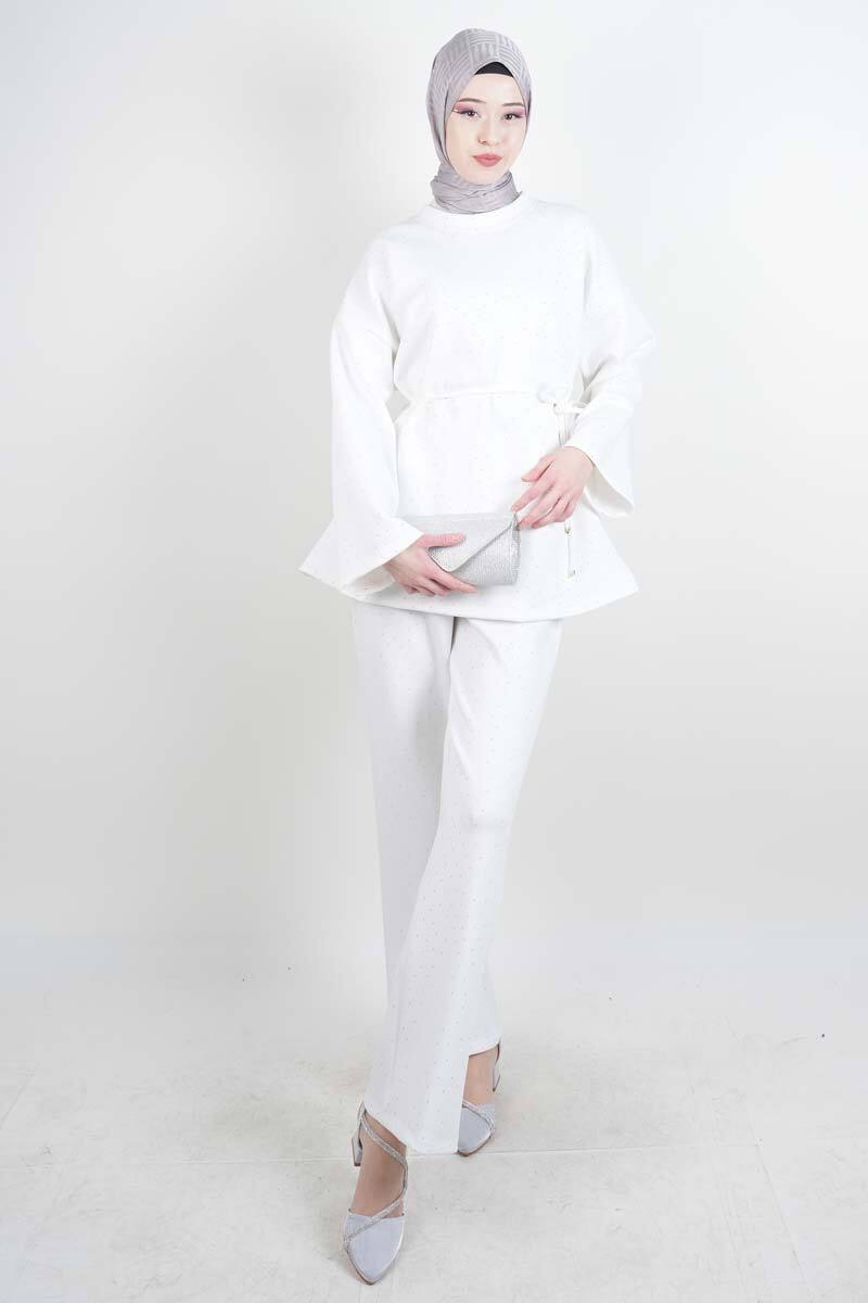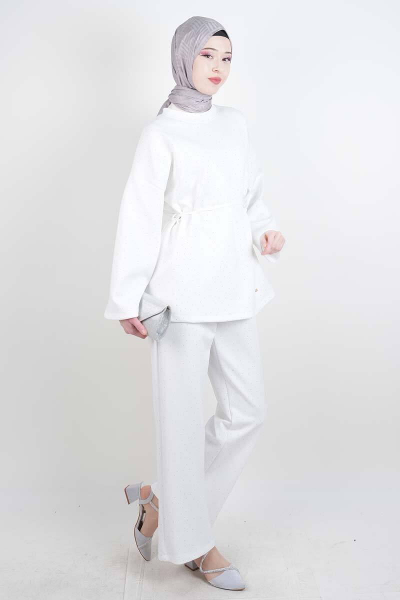 Tesettür Takım Bel İpli Full Taş Detay Scuba İkili Takım Beyaz