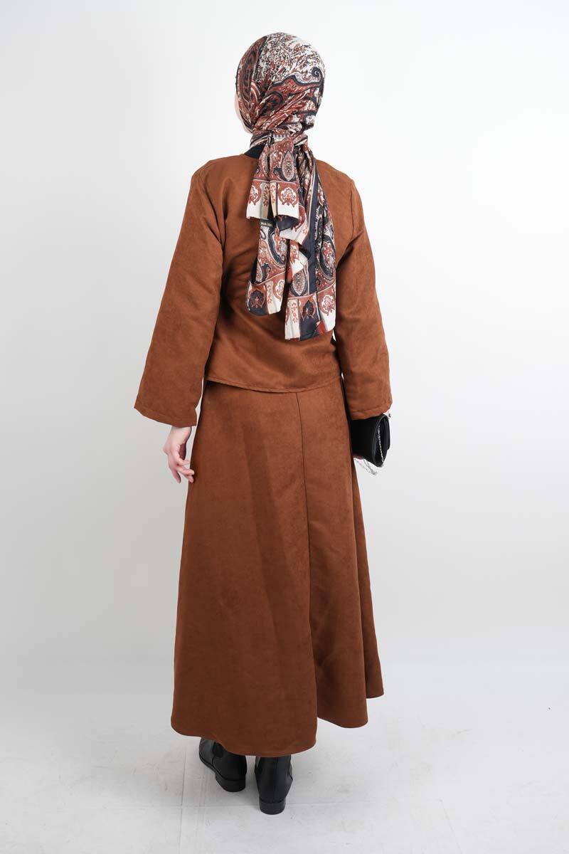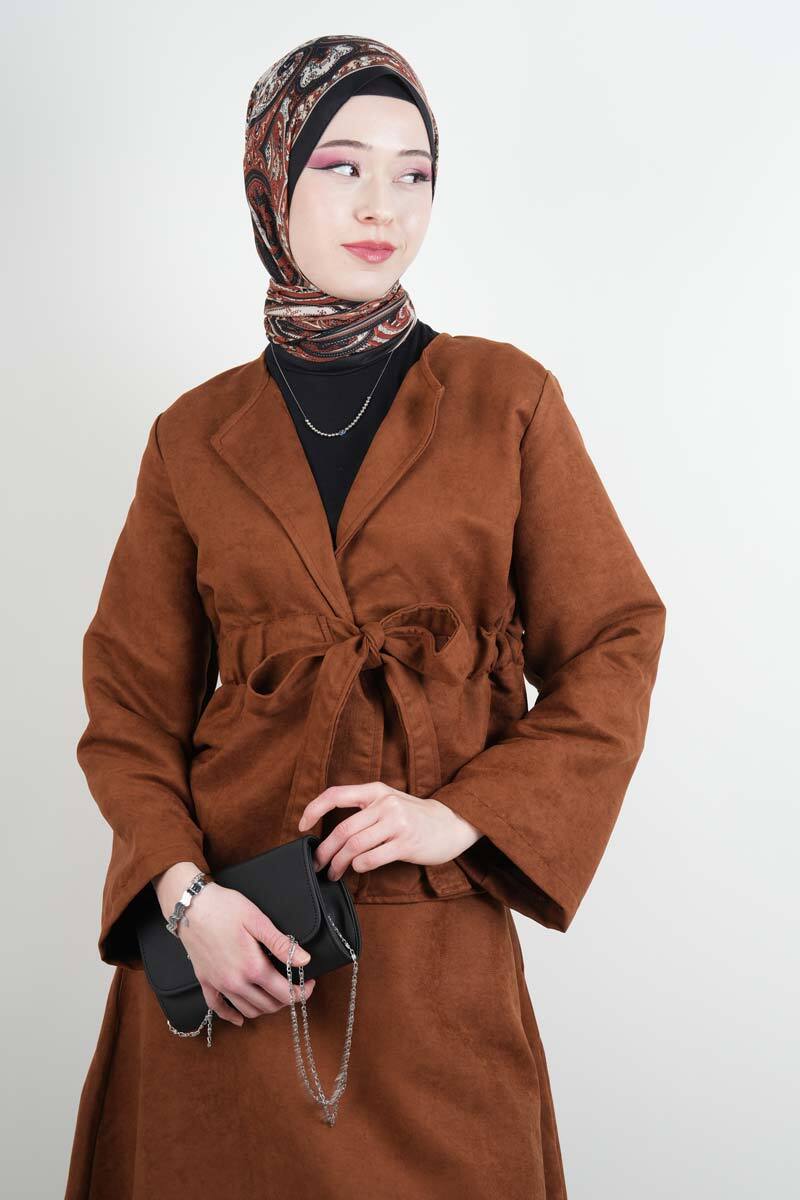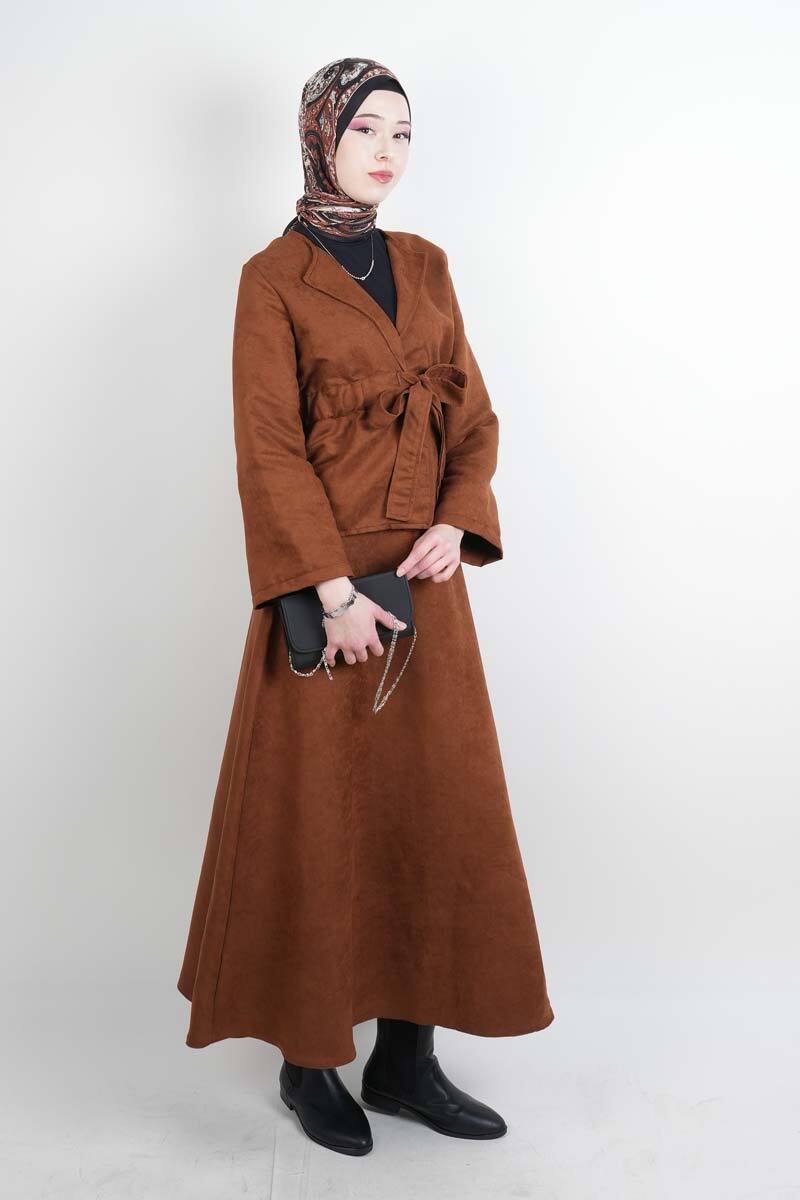 Tesettür Takım Beli Tünelli Ceketli Süet Etekli İkili Takım Taba