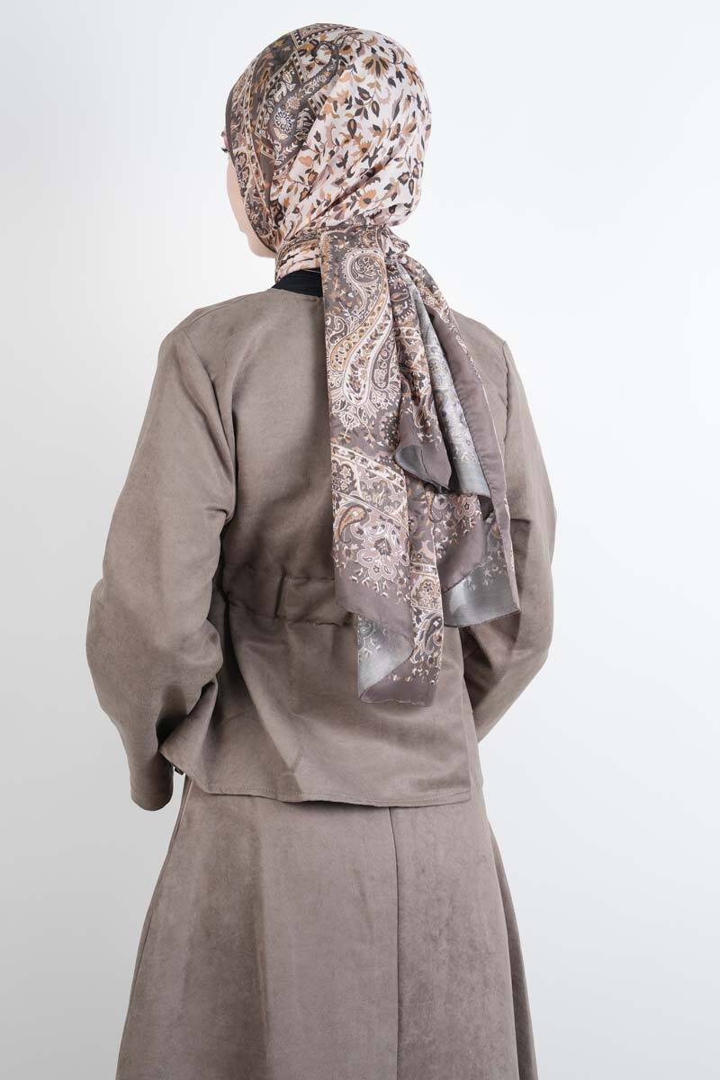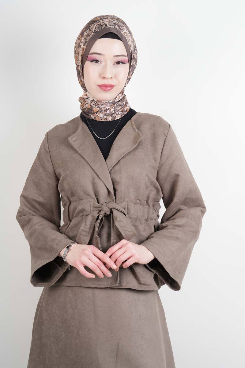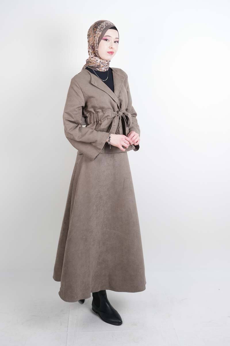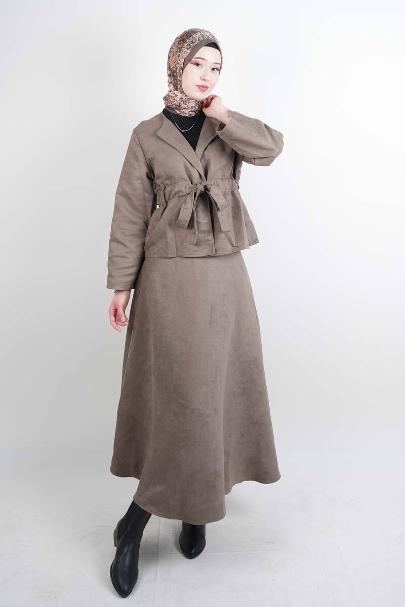 Tesettür Takım Beli Tünelli Ceketli Süet Etekli İkili Takım Vizon