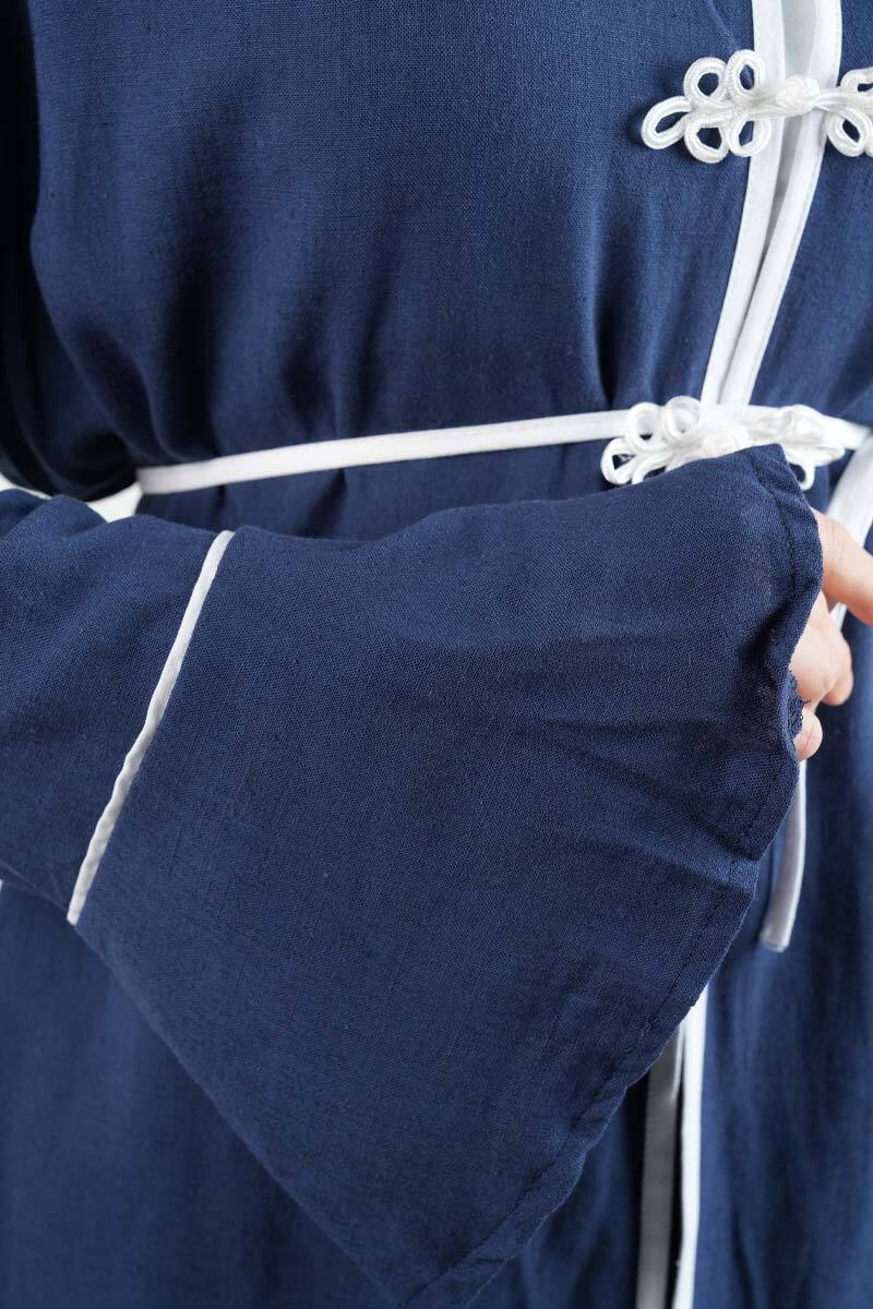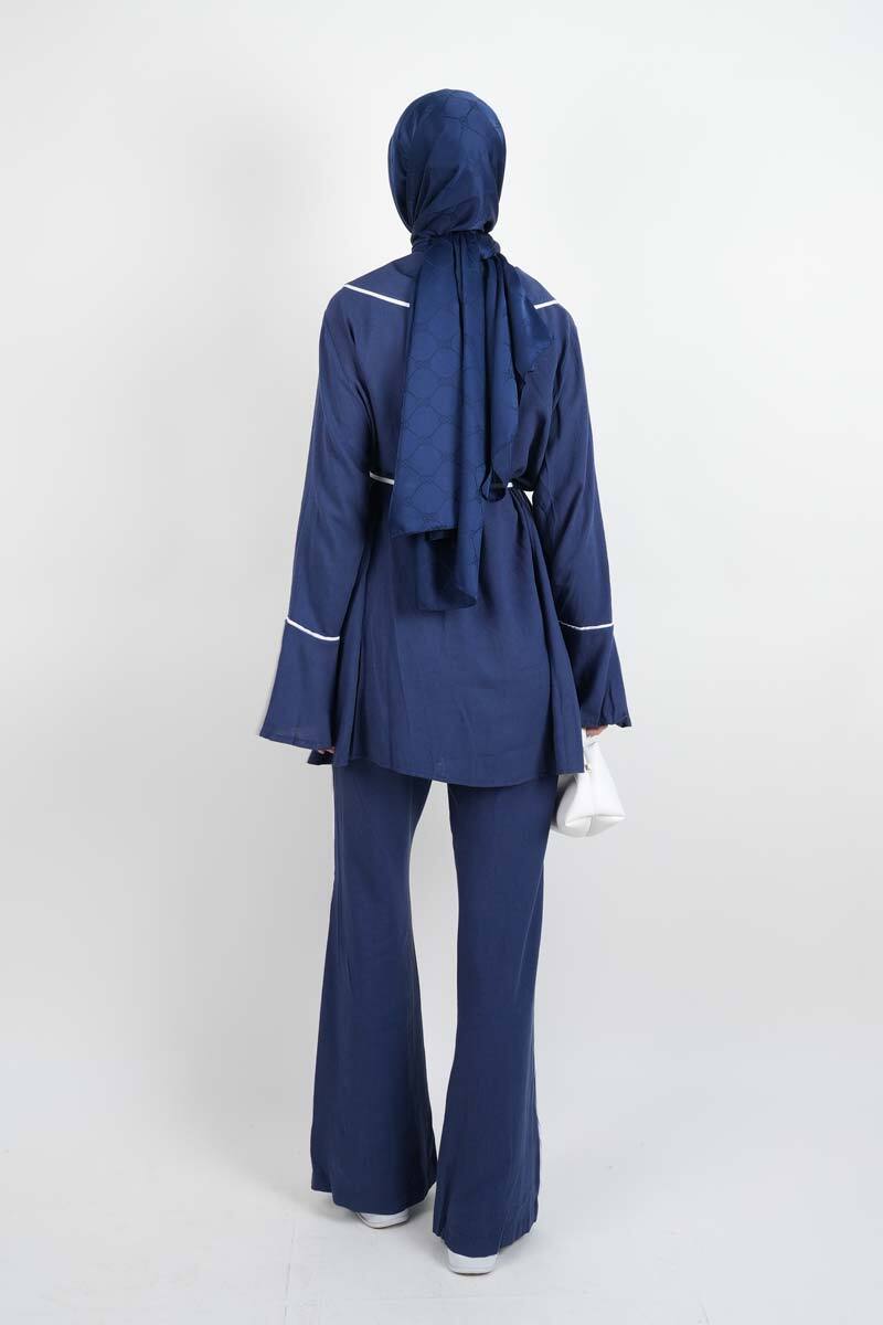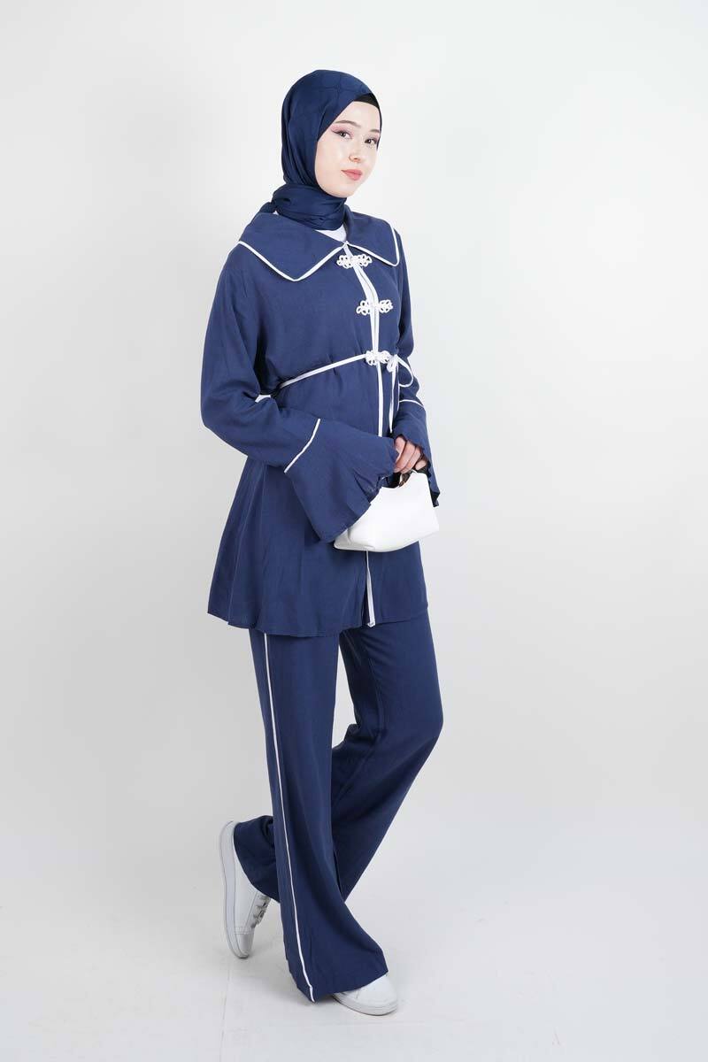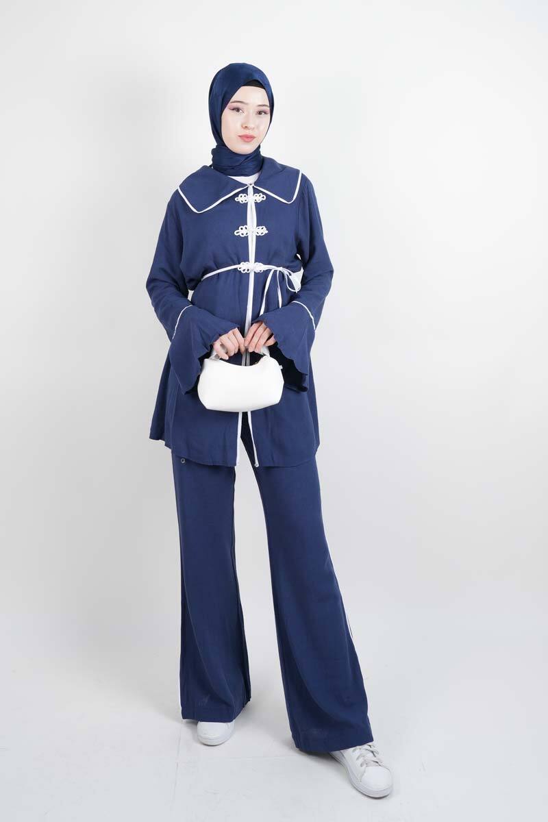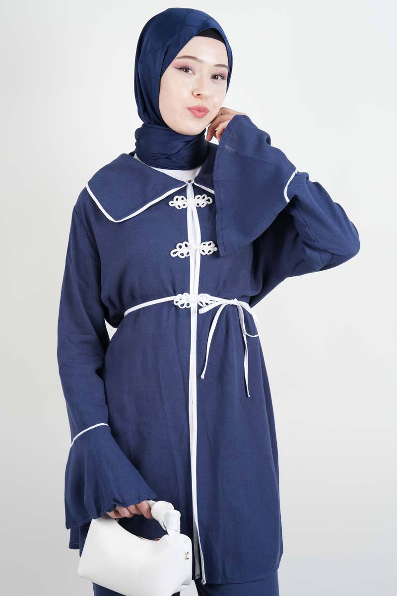 Tesettür Takım Biye Det. Kol Volanlı Keten 2'li takım Lacivert