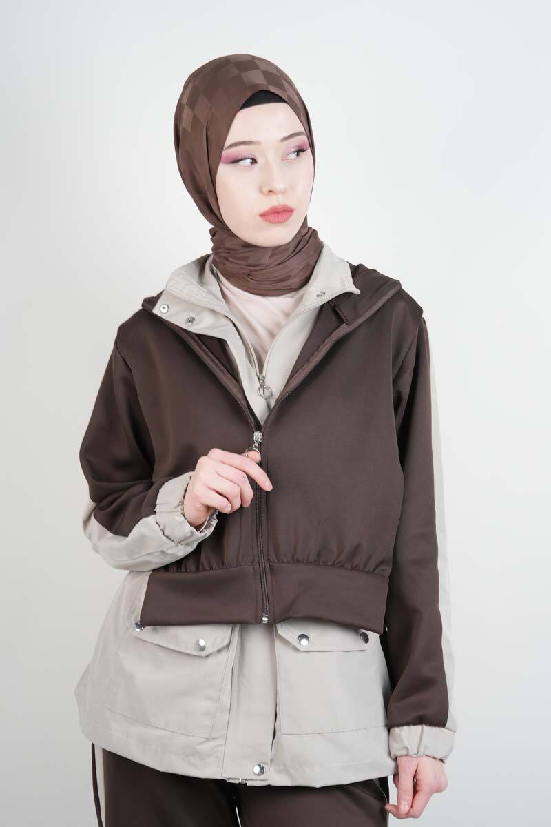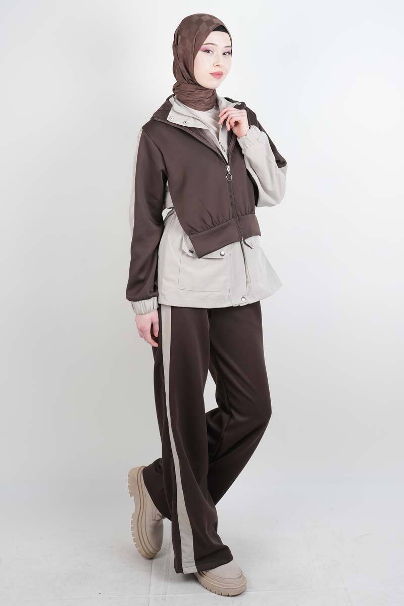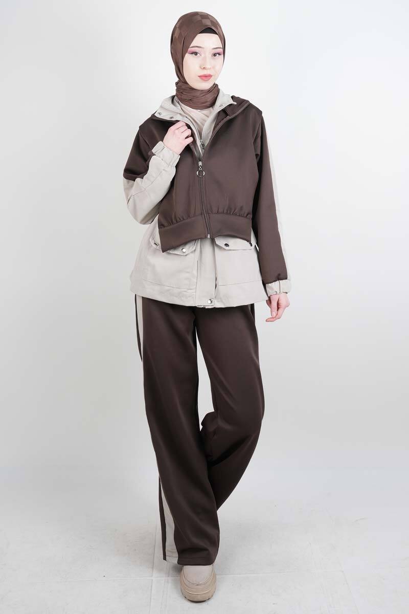 Tesettür Takım Yandan Fermuarlı Tansel Etekli İkili Takım Kahverengi