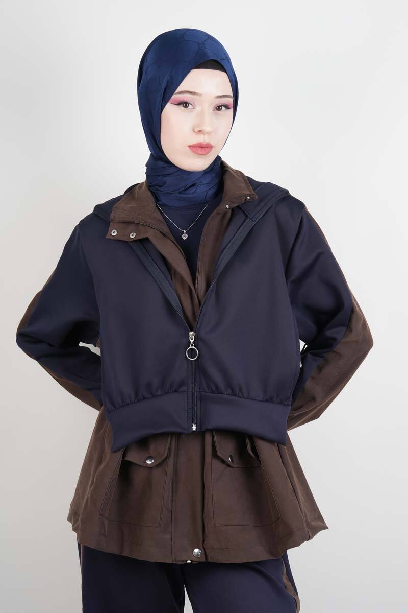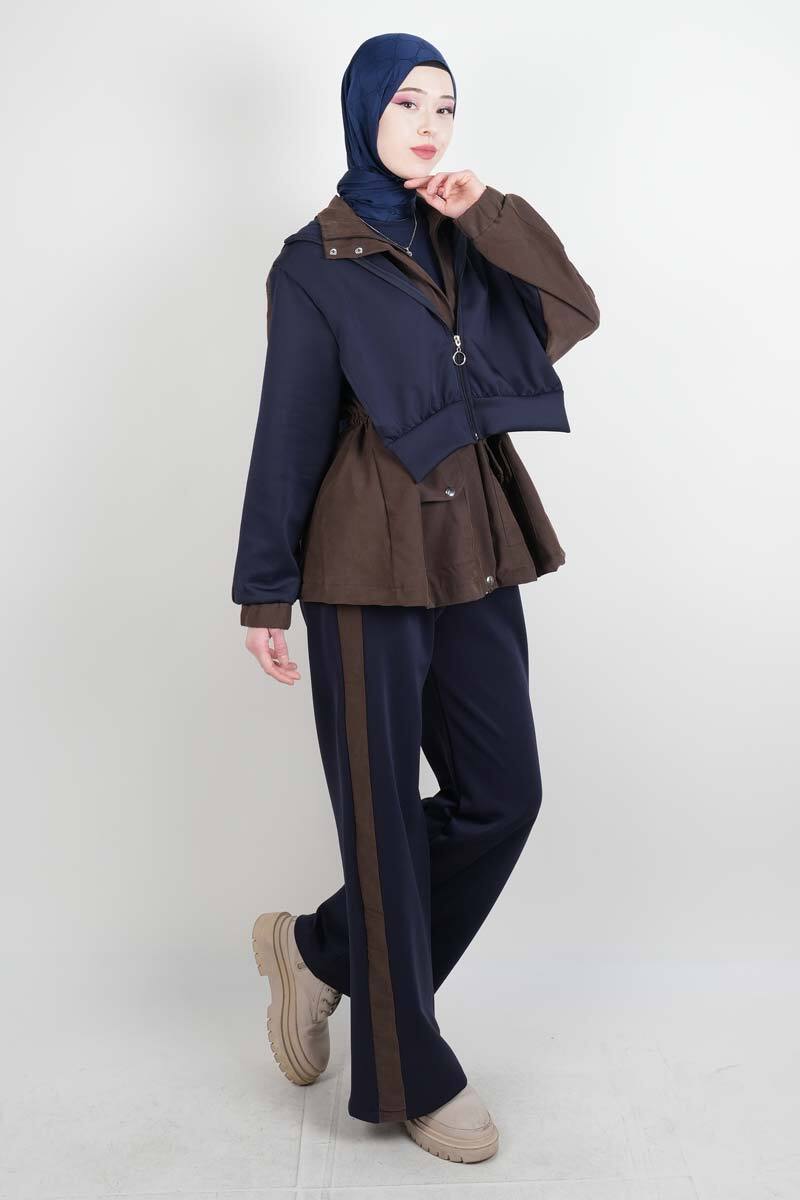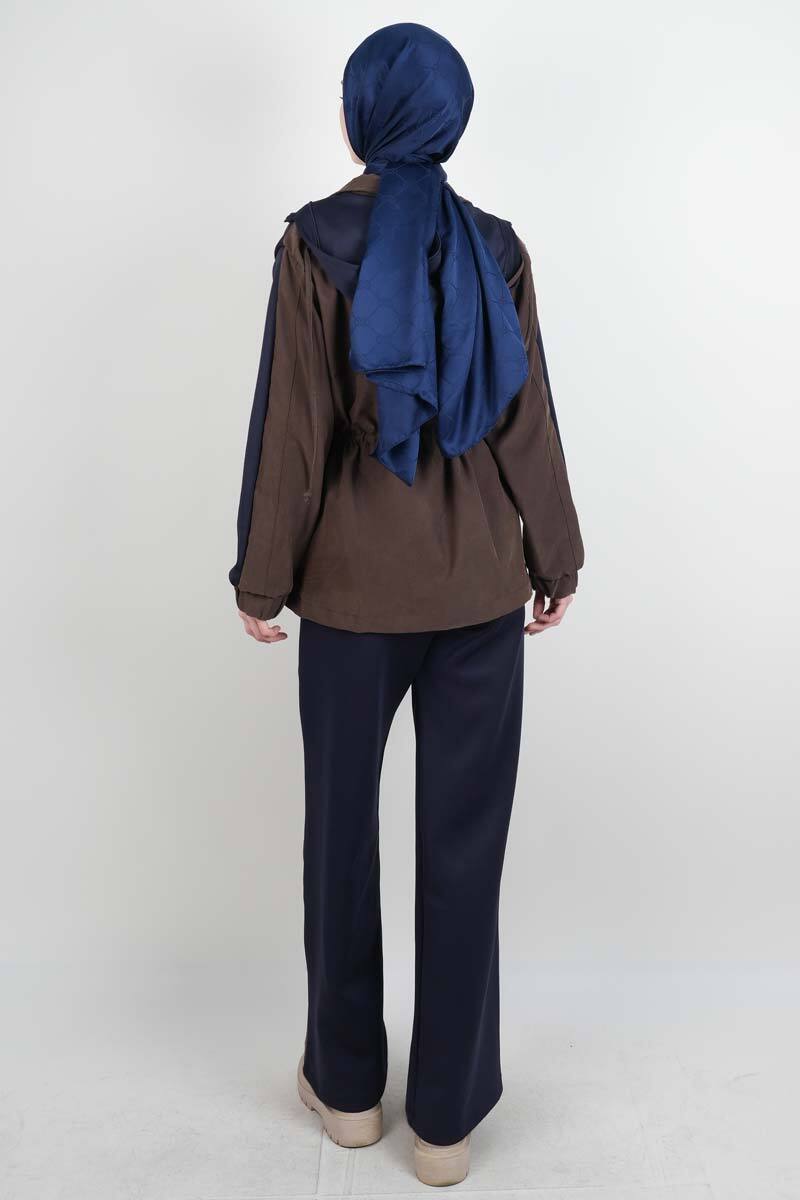 Tesettür Takım Çift Kapak Kapüşonlu Trenç İkili Takım Kahverengi