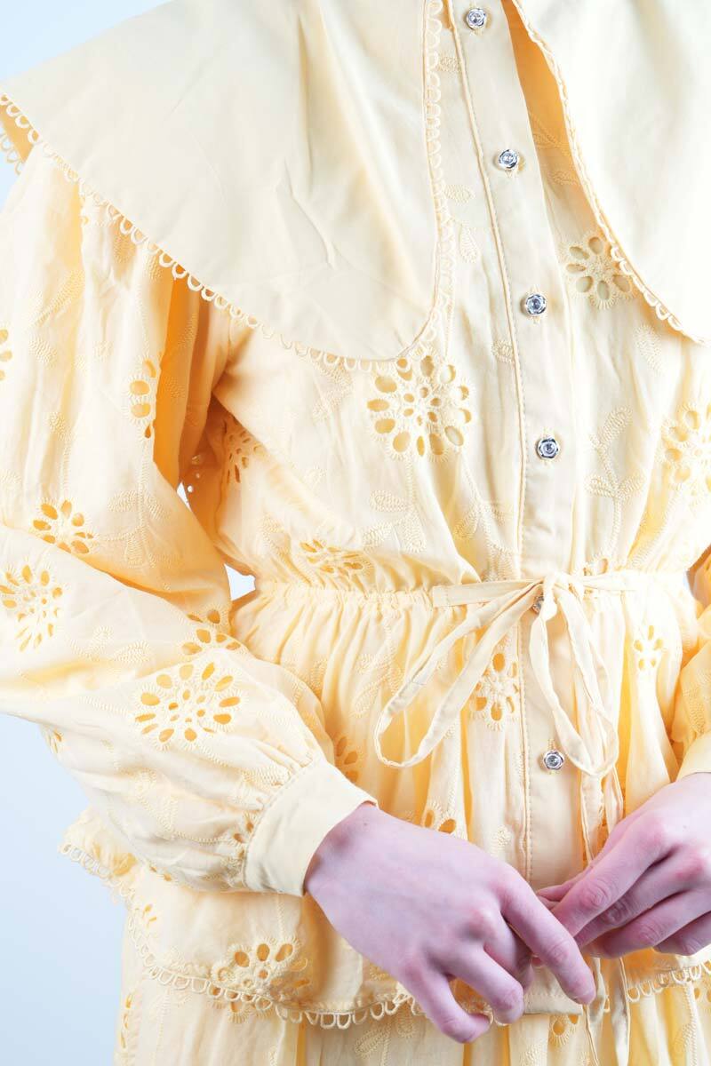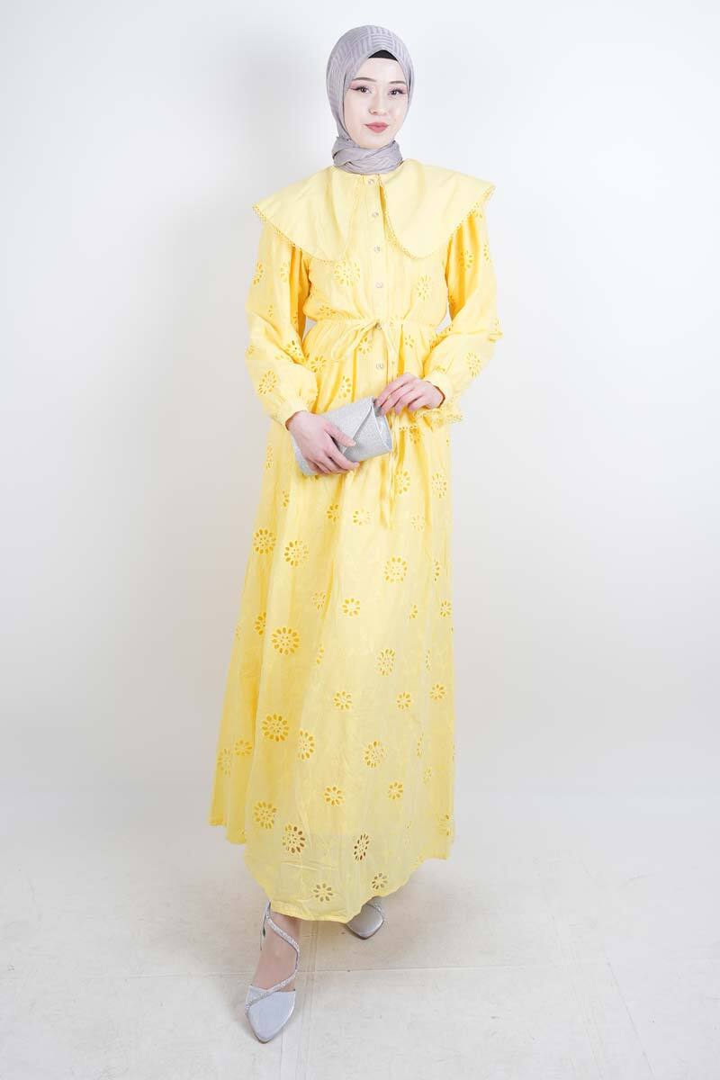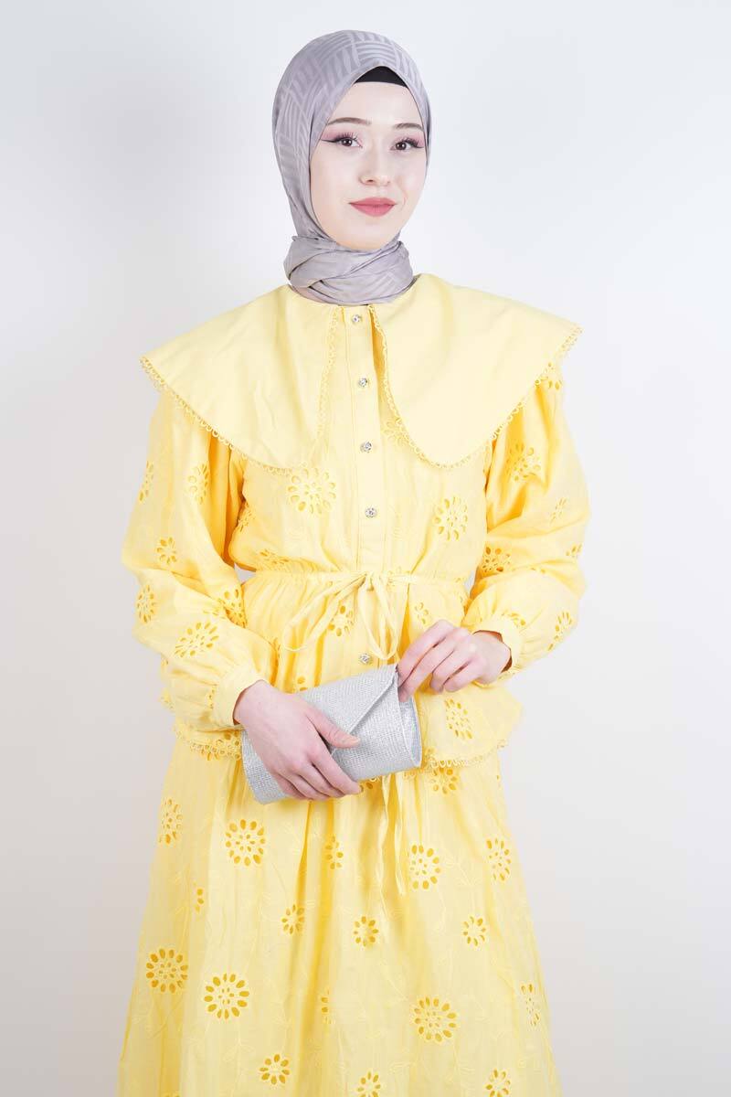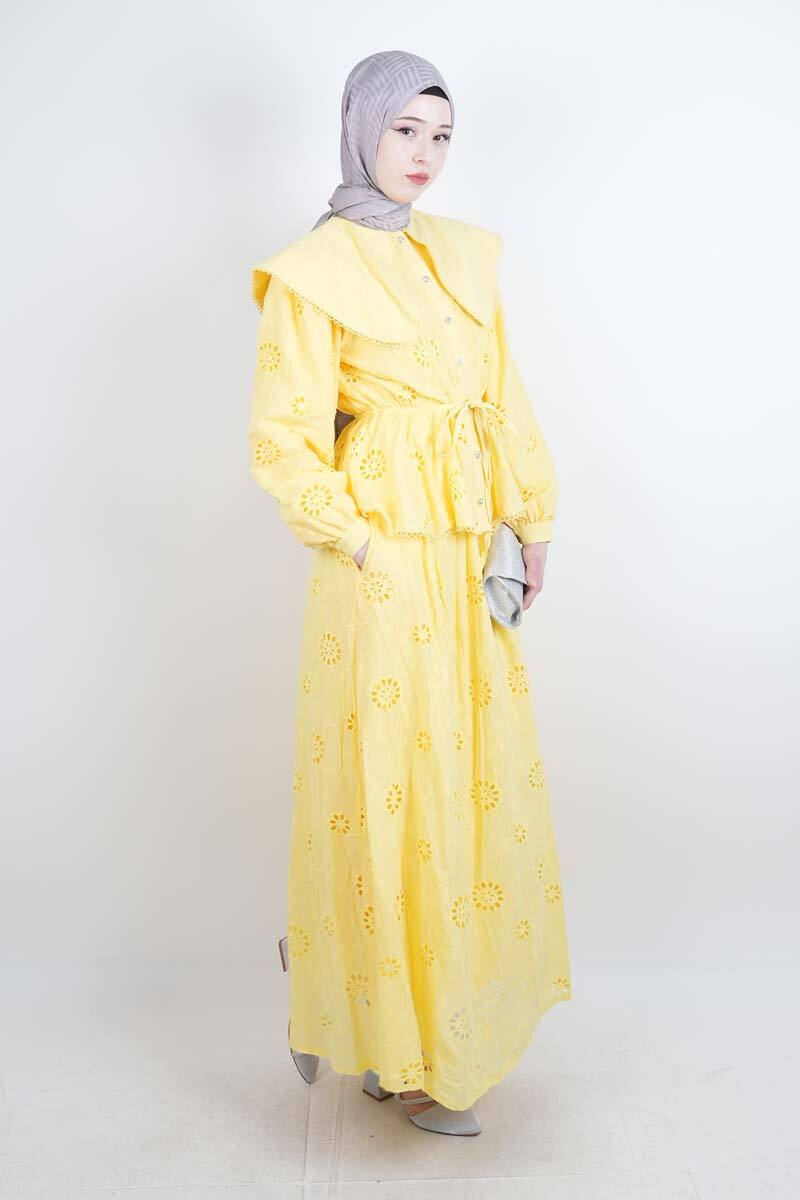 Tesettür Takım Geniş Bebe Yaka Bel Lastikli Fisto Etekli İkili Takım Sarı