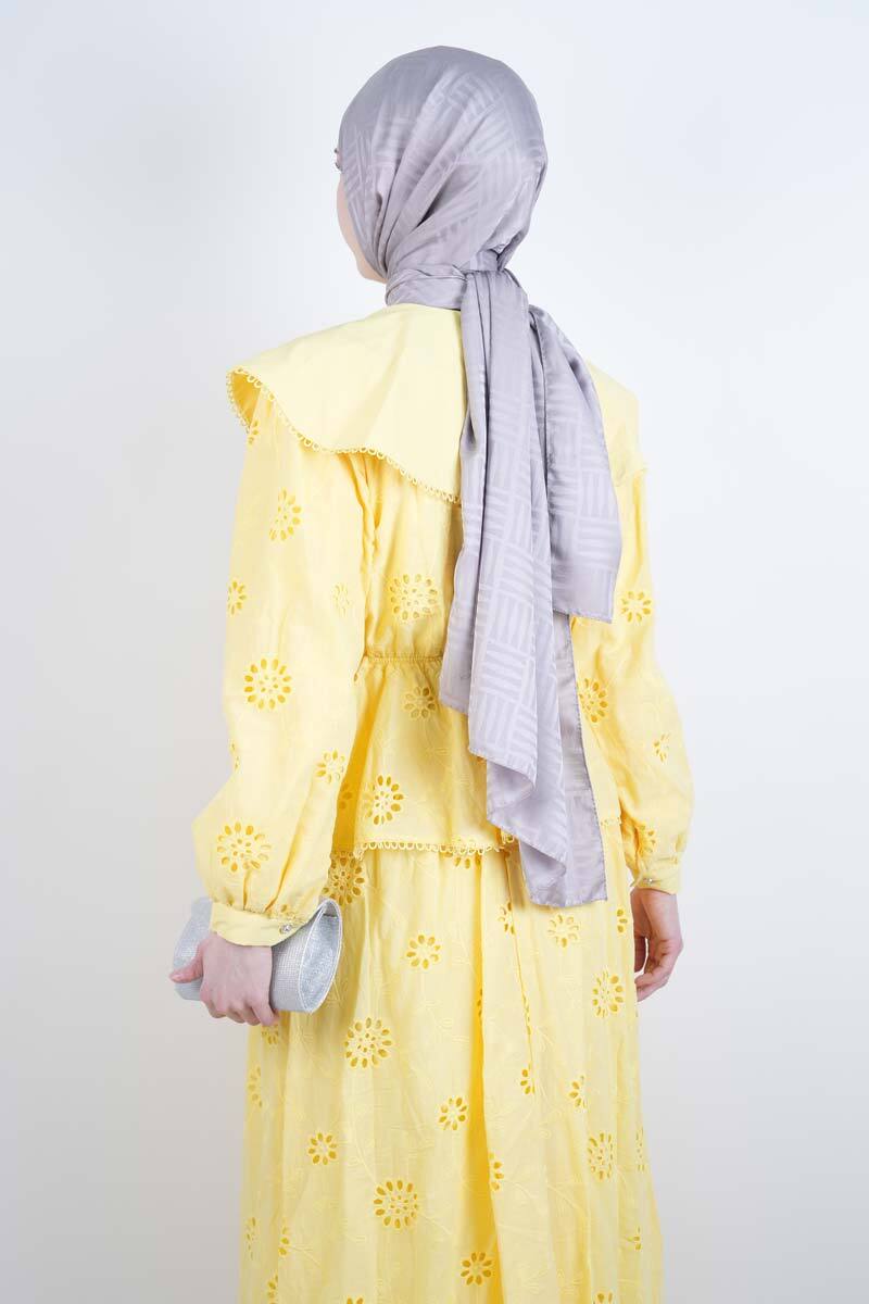 Tesettür Takım Kendinden Çiçek Kabartmalı Desenli Etekli İkili Takım Sarı