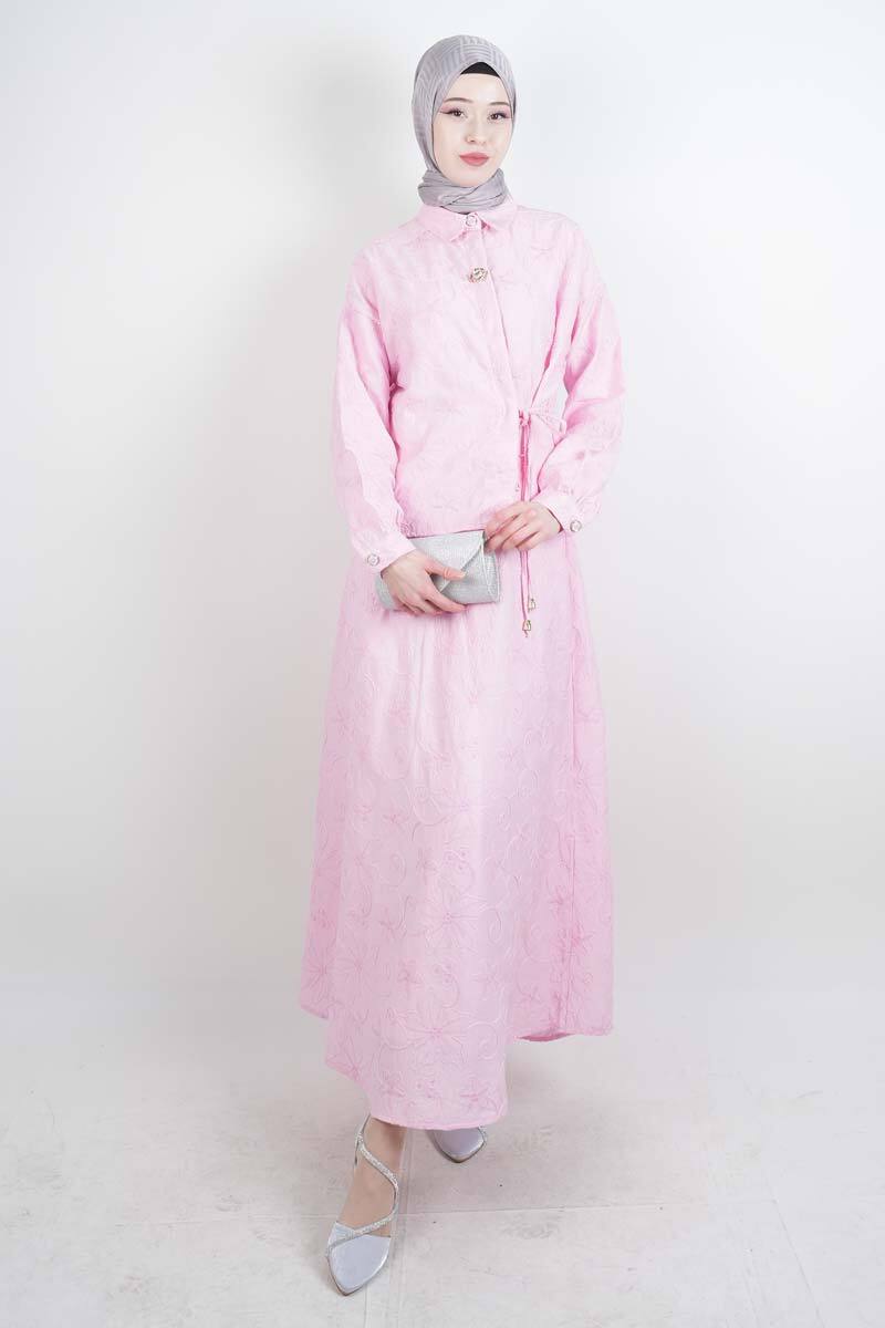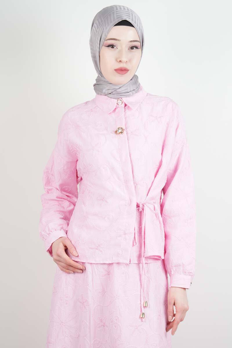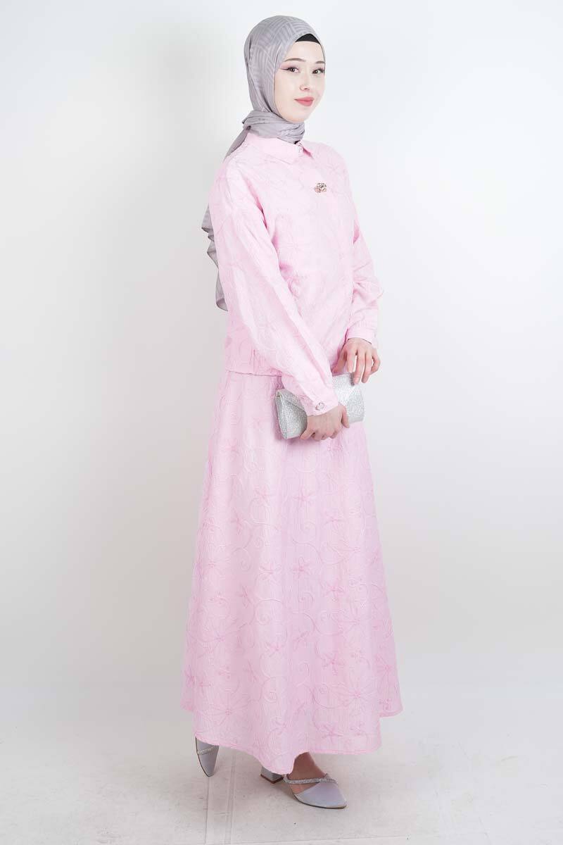 Tesettür Takım Kendinden Çiçek Kabartmalı Desenli Etekli İkili Takım Pembe