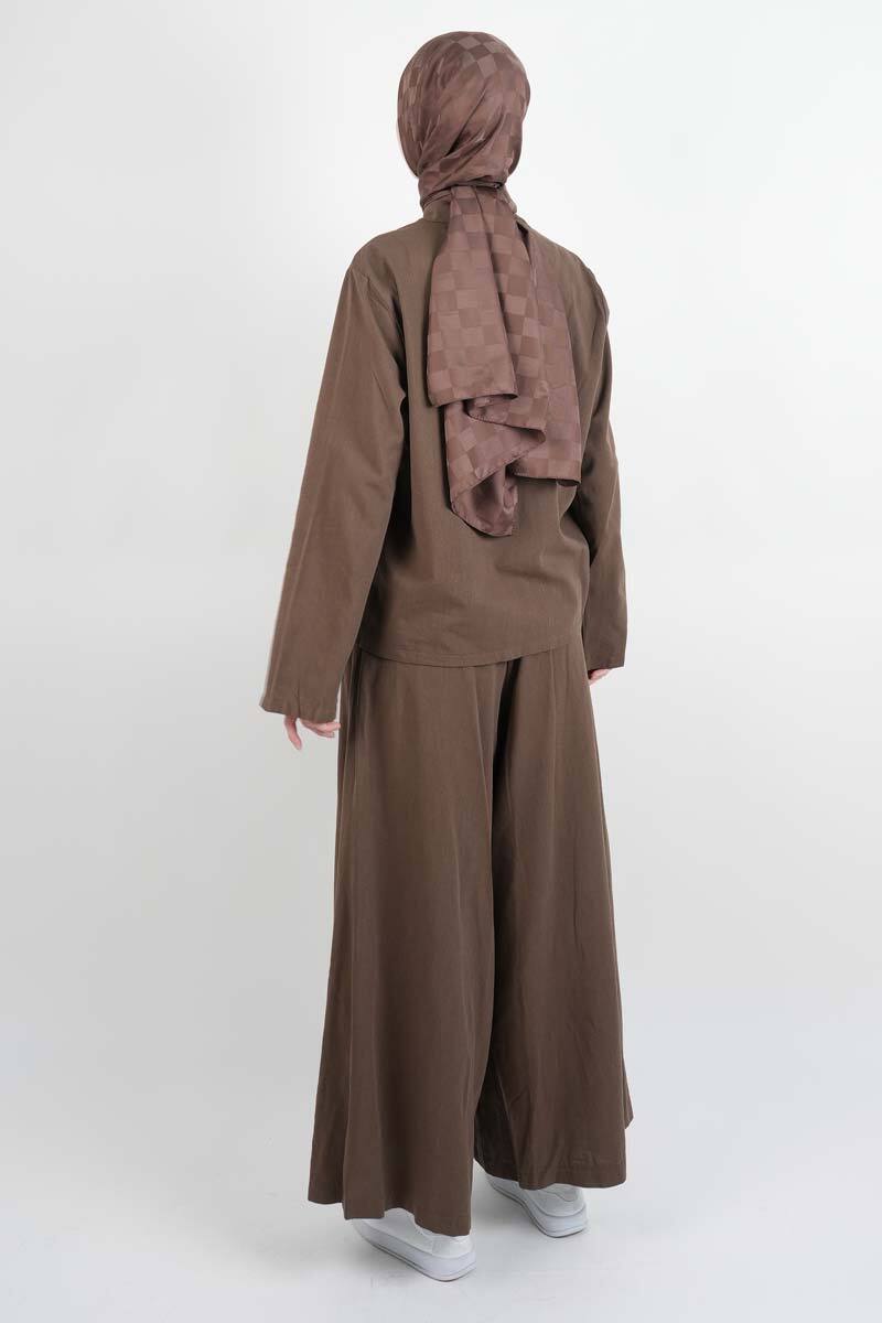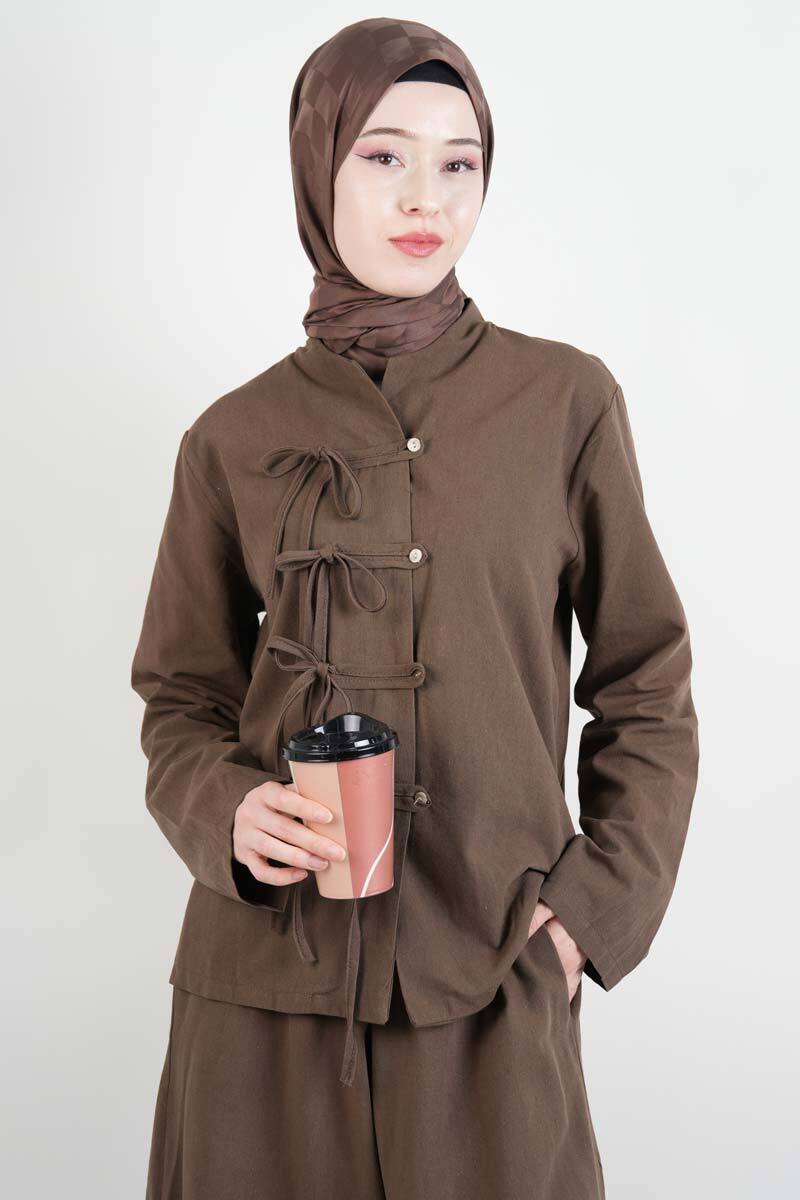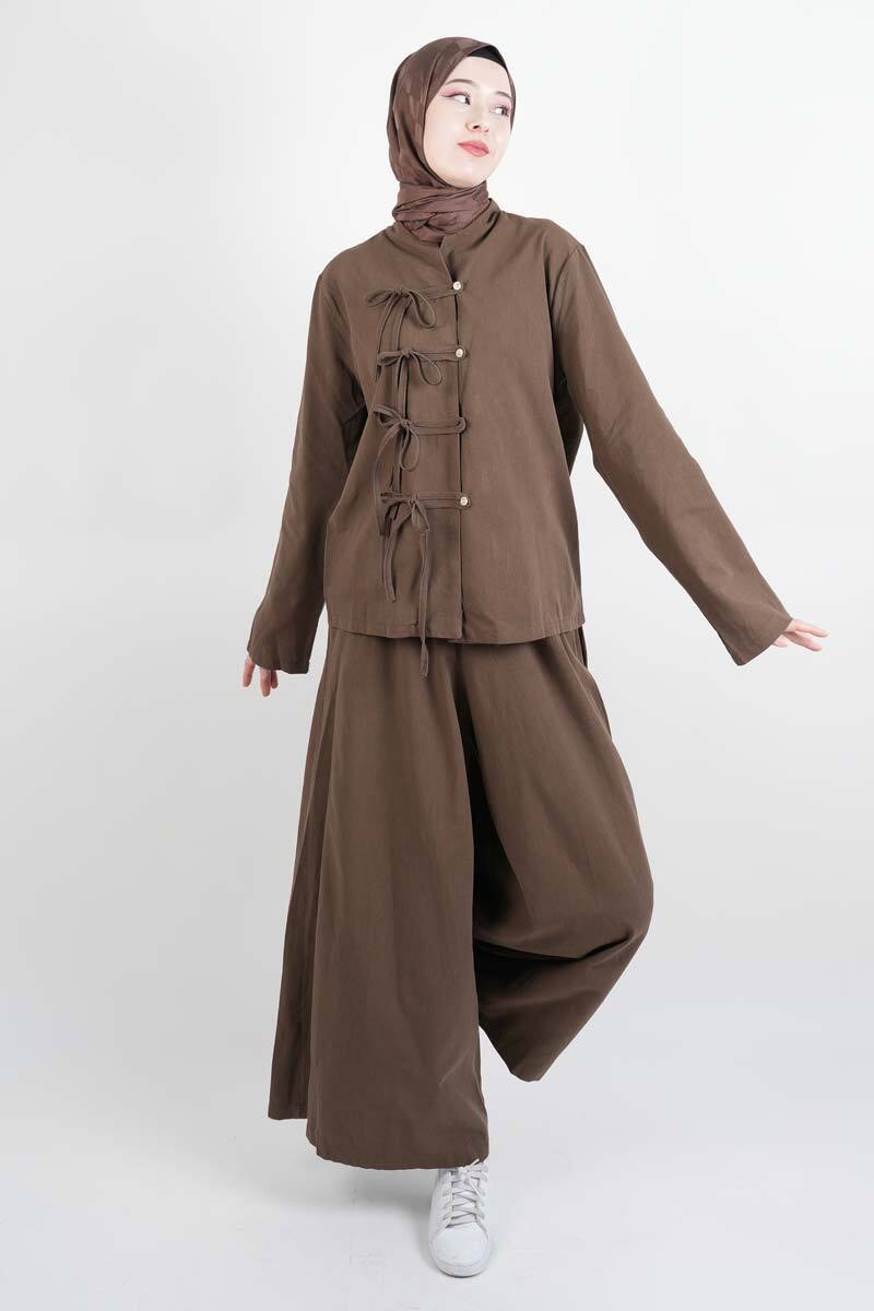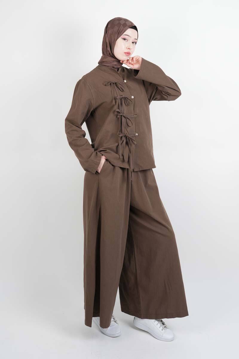 Doğallığın ve zarafetin birleştiği ön bağcık detaylı keten bol paçalı 2'li takım, rahat ve şık giyinmeyi sevenler için tasarlandı. Yüksek kaliteli keten kumaşı sayesinde hem hafif hem de ferah bir kullanım sunar. Takım içeriğinde bağcık detaylı üst ve bol paçalı pantolon bulunmaktadır.