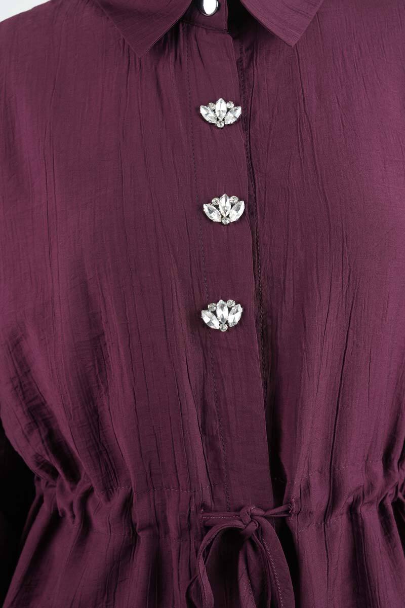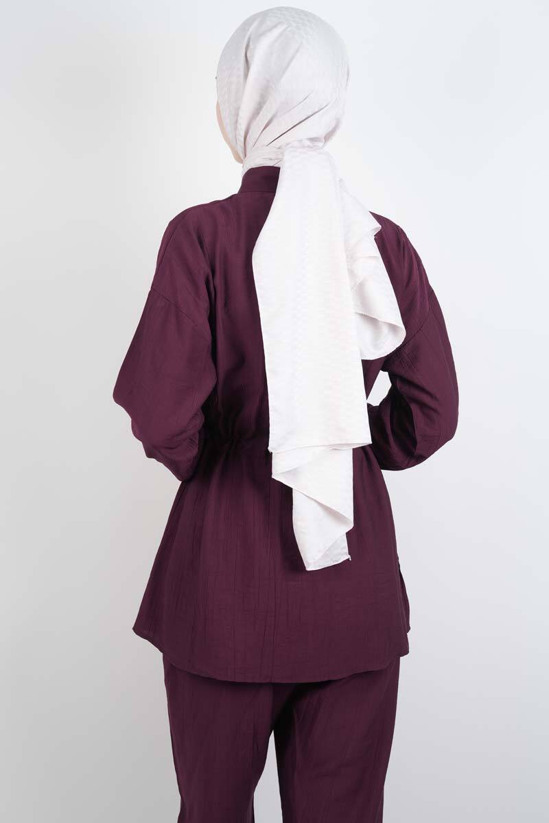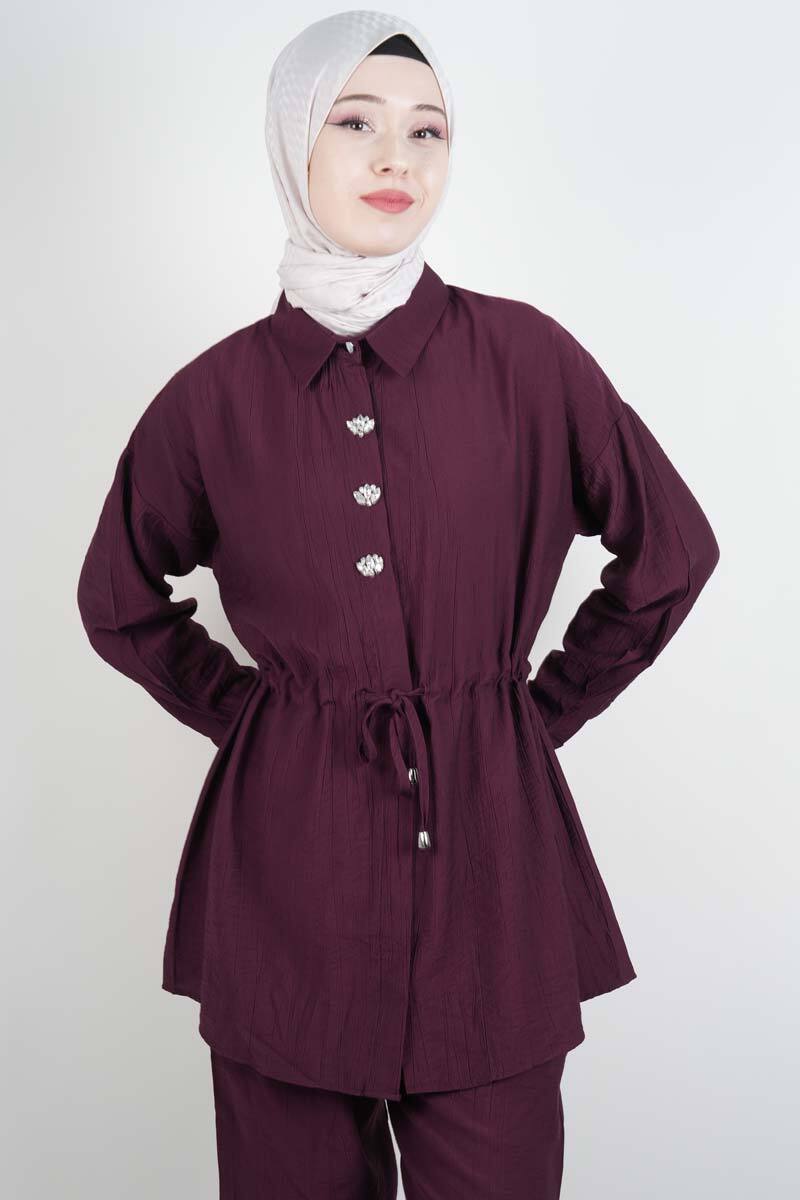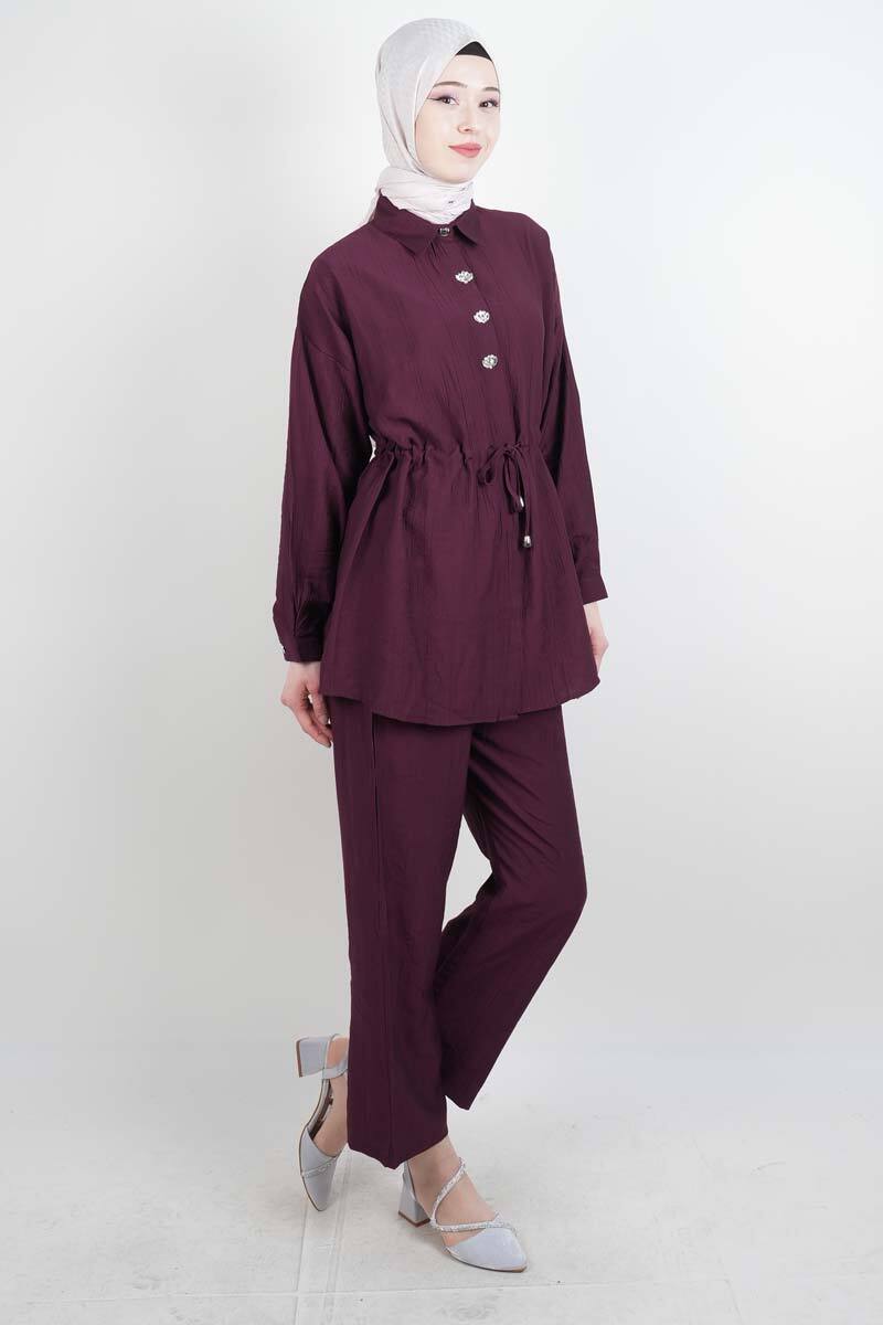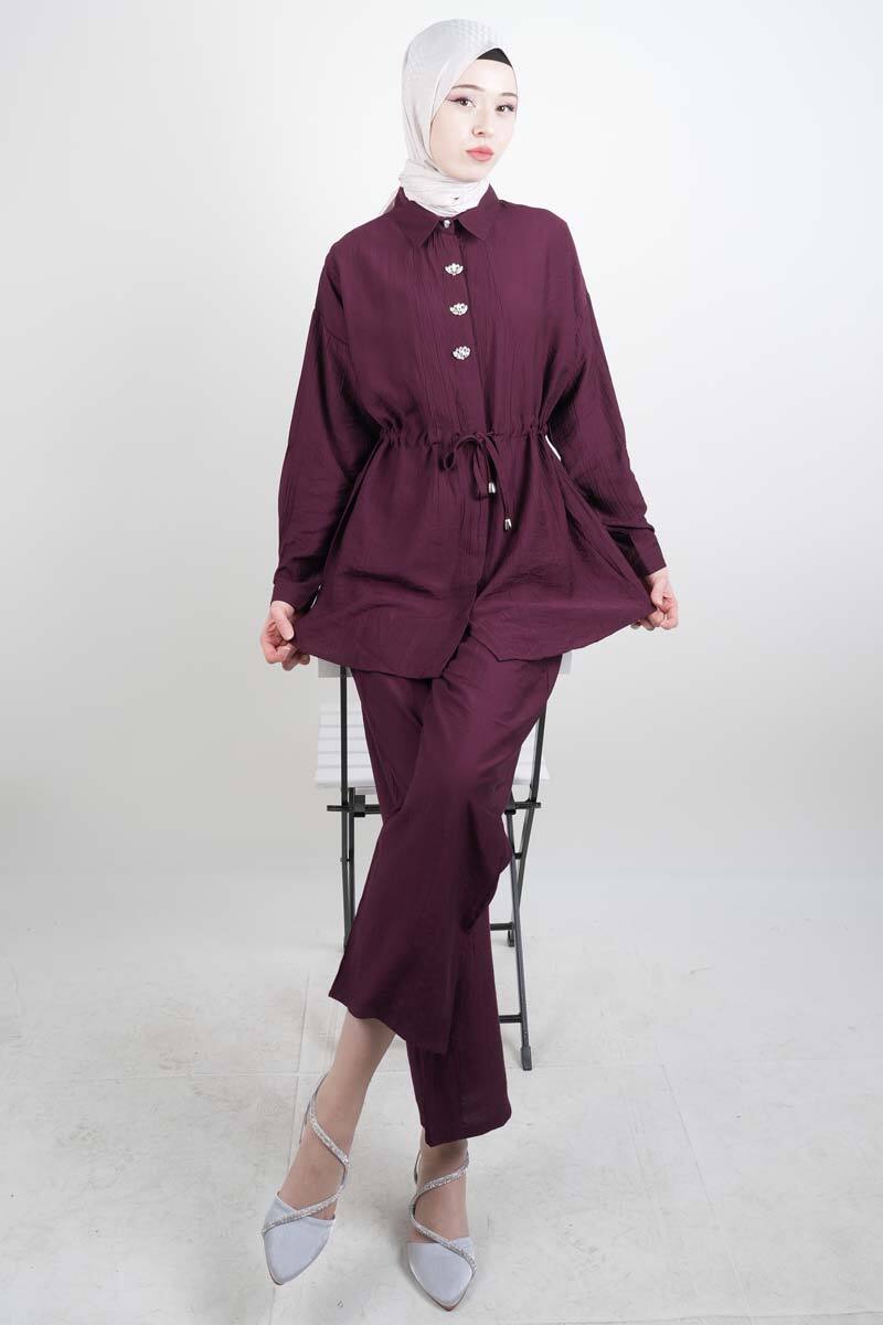 Tesettür Takım Taş Düğmeli Bel Tünelli İkili Takım Mürdüm