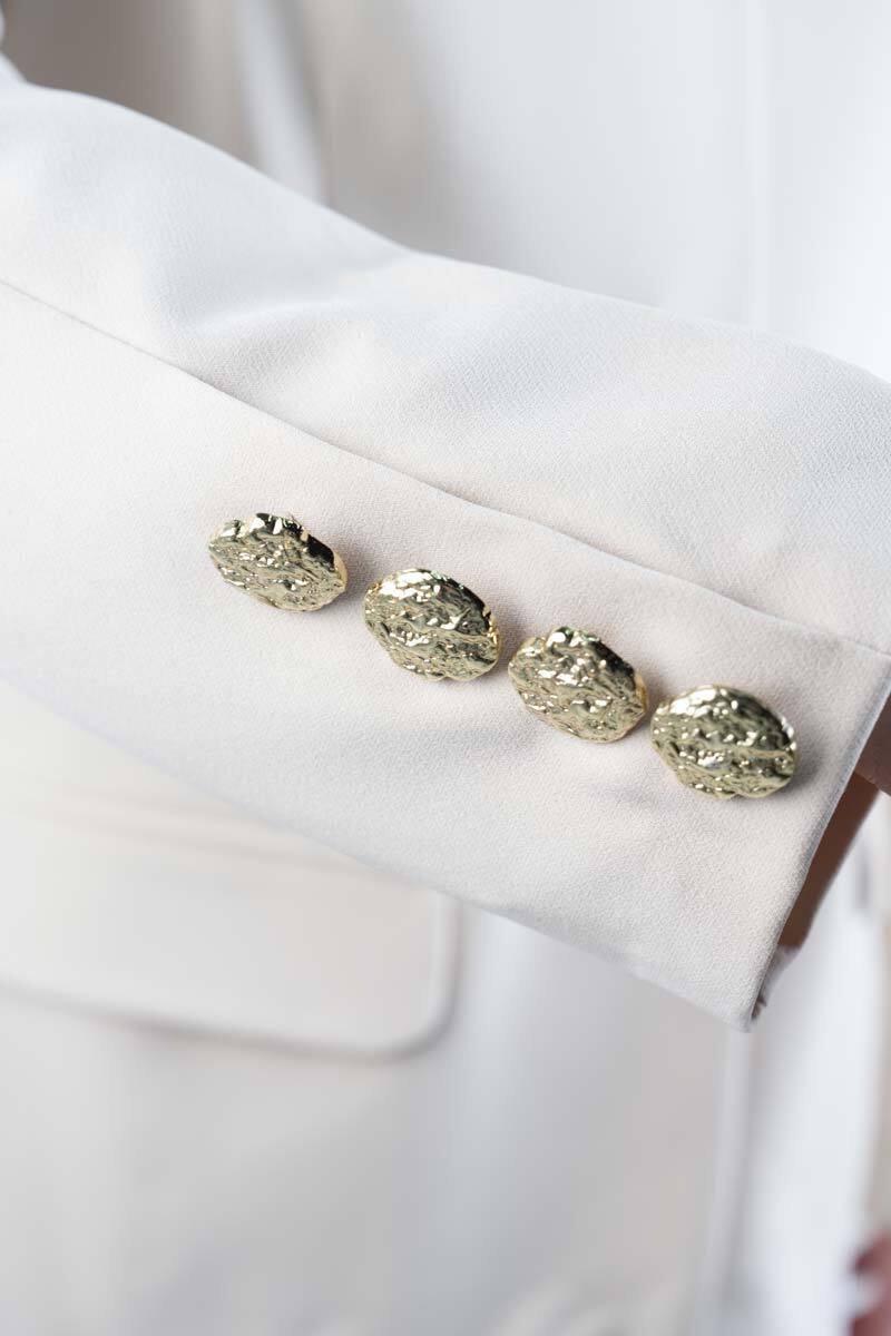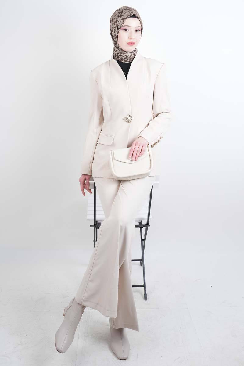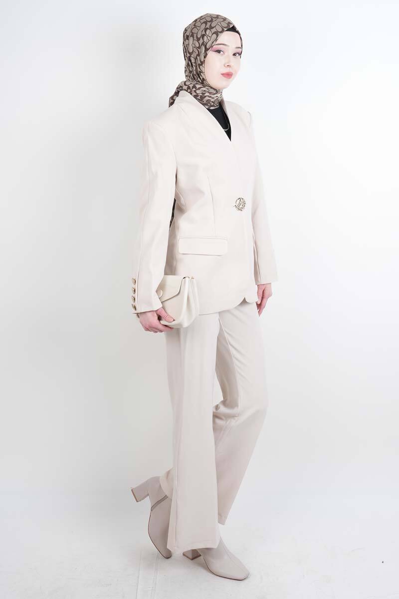 Tesettür Takım Tek Gold Düğmeli Blazer İkili Takım Krem