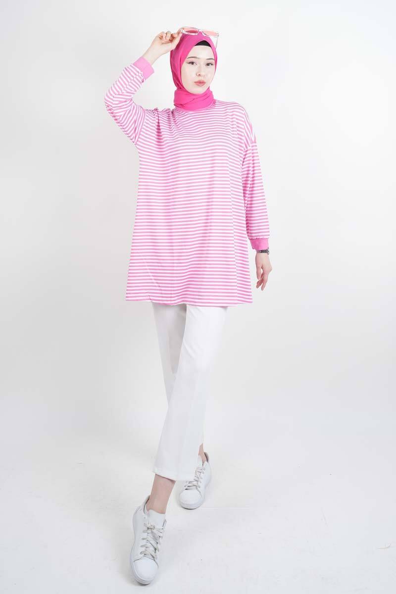 Tesettür Tunik İnce Çizgili Penye Tunik Açık Pembe