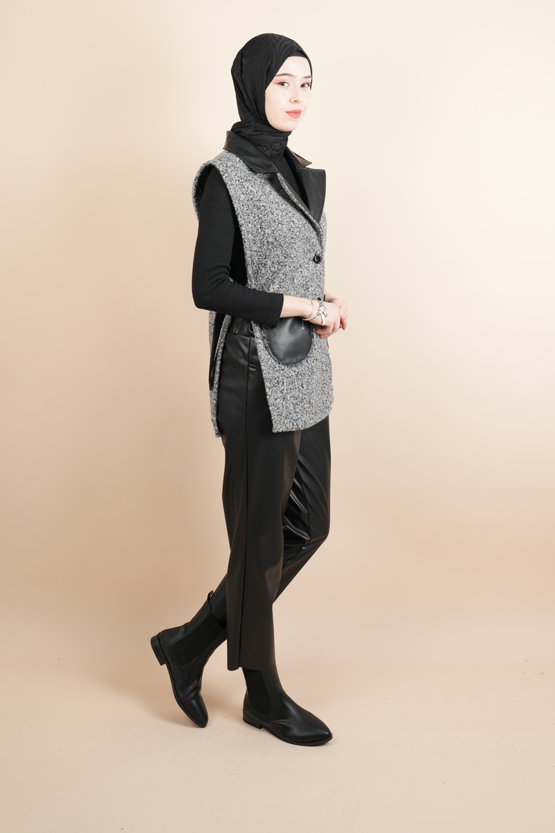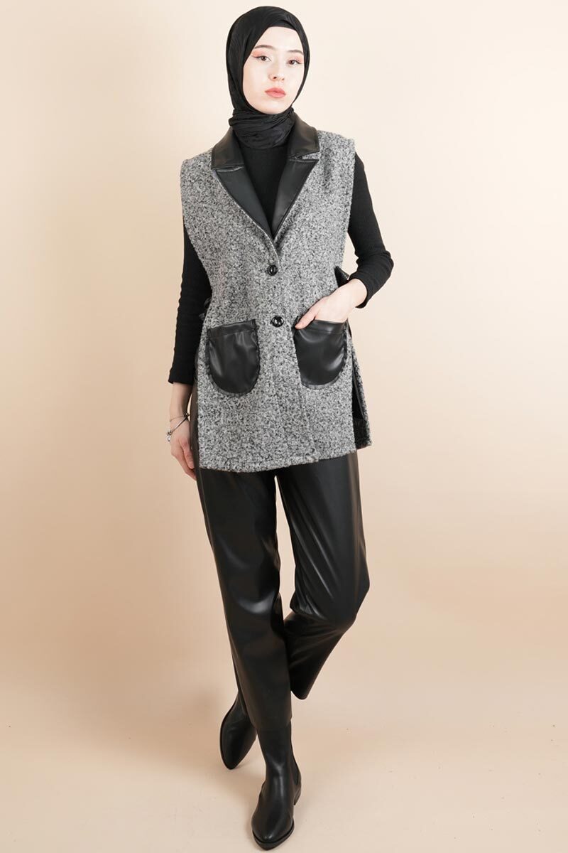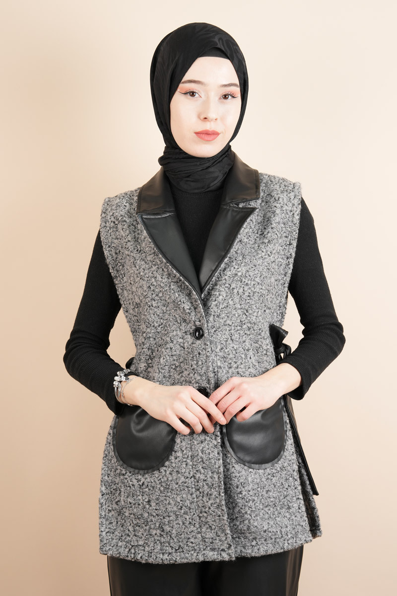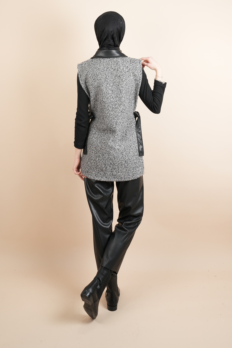 Tesettür Yelek Deri Detaylı Yandan Bağlamalı Teddy Yelek Gri