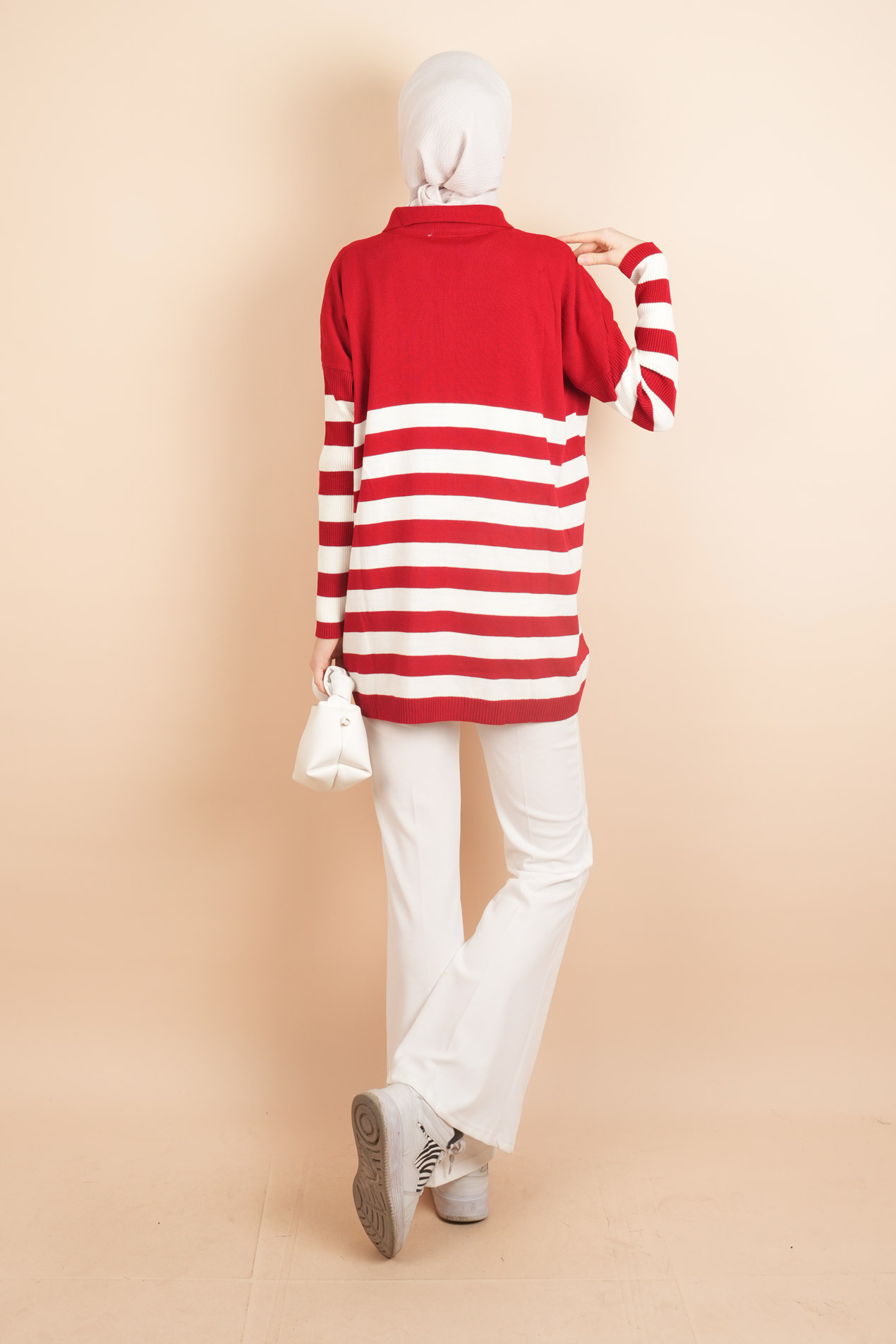 V Yakalı Üst Gömlek Yaka Çizgili Basic Tunik Kazak Kırmızı