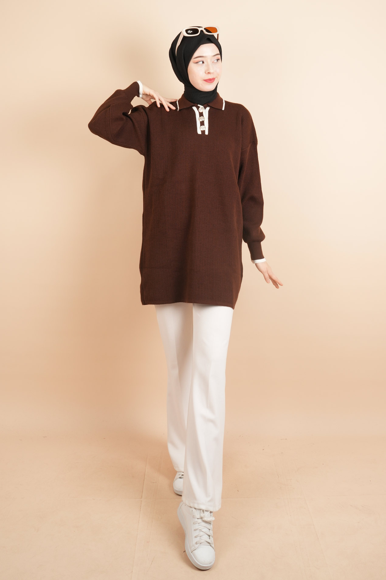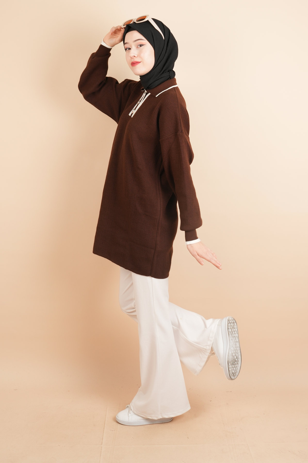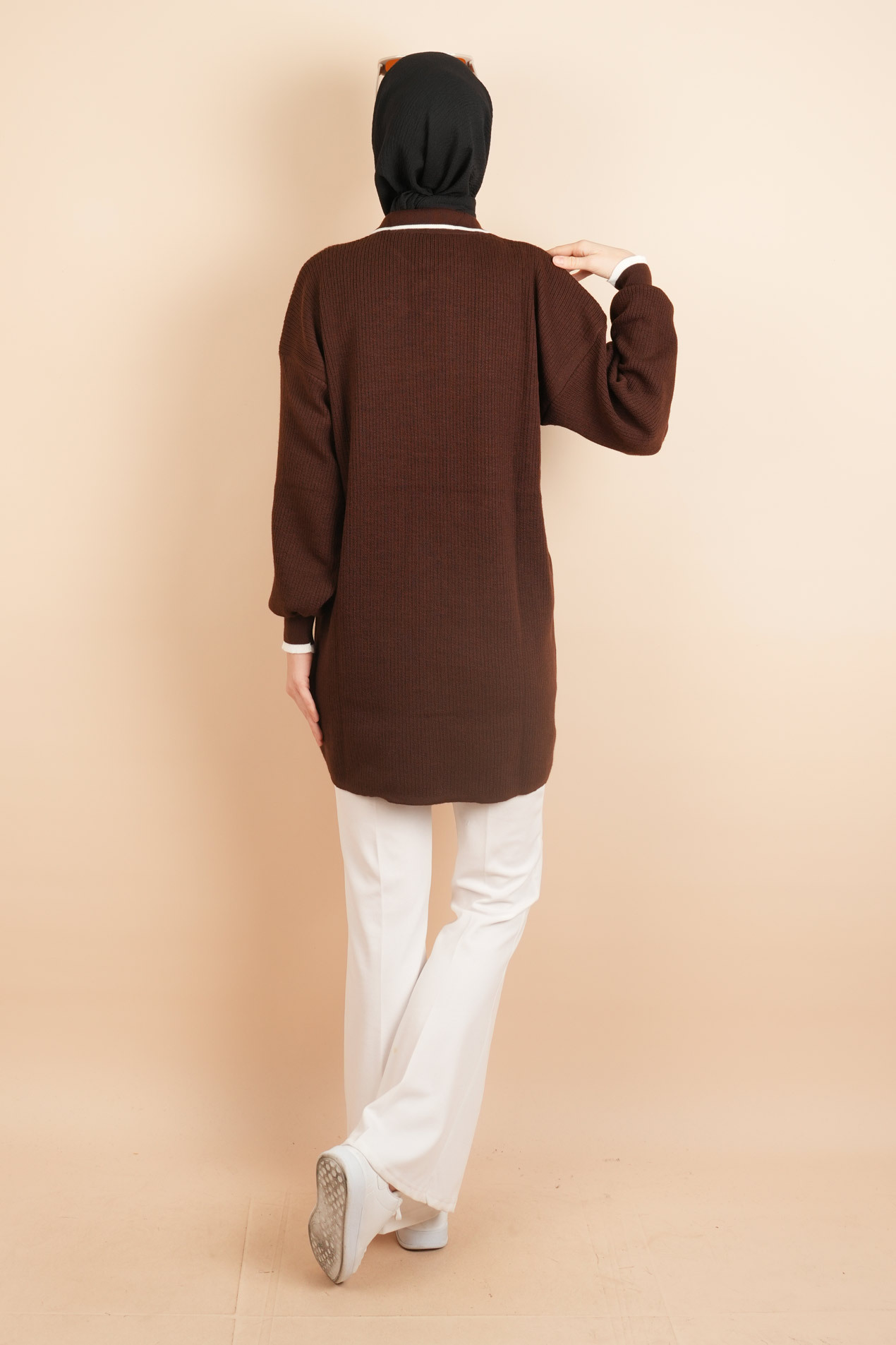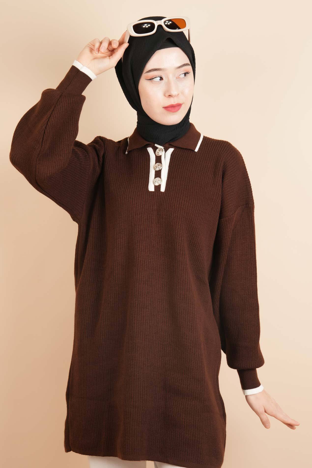 Yaka Ve Düğme Detaylı Tesettür Tunik Kazak Kahverengi