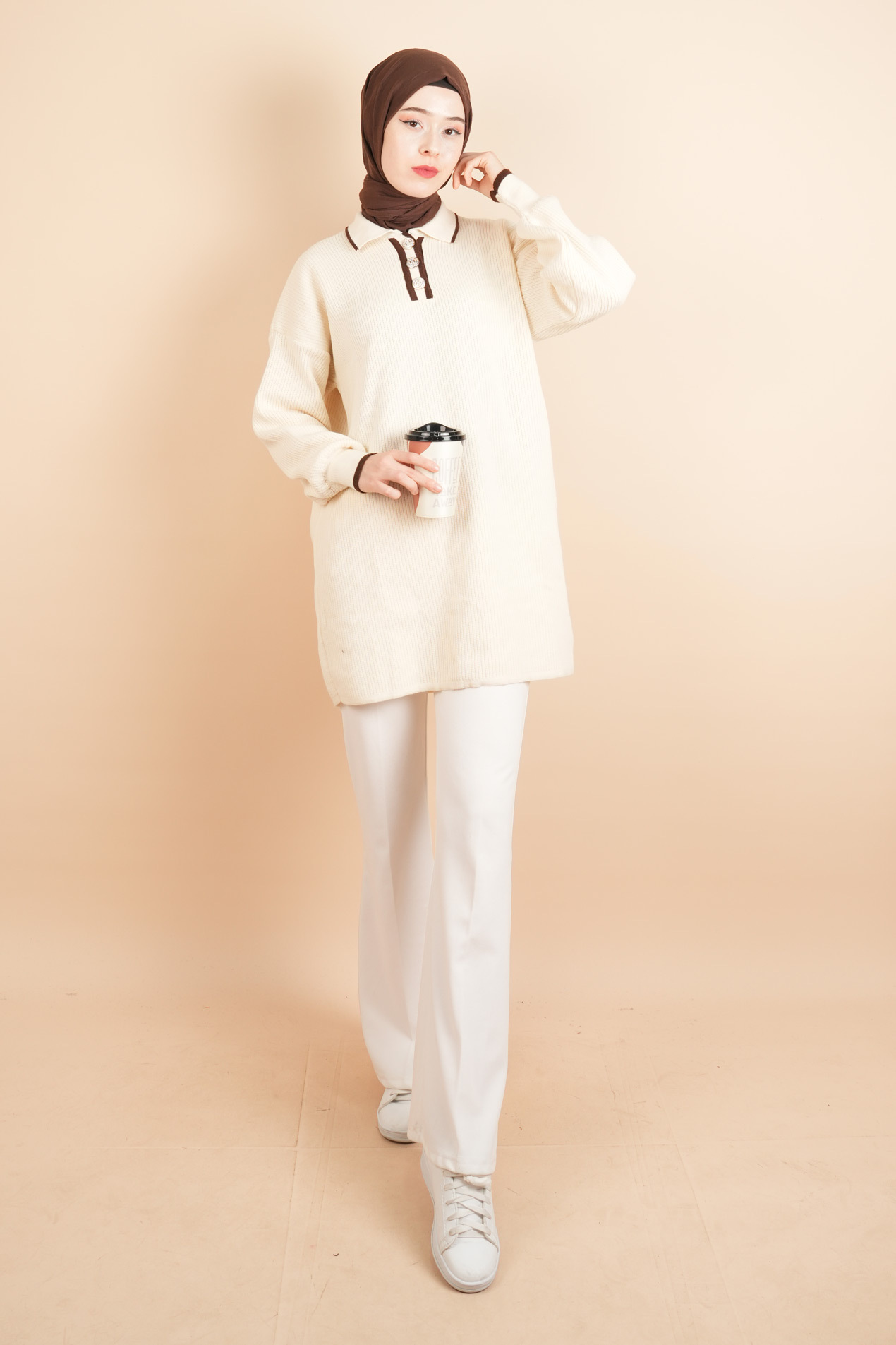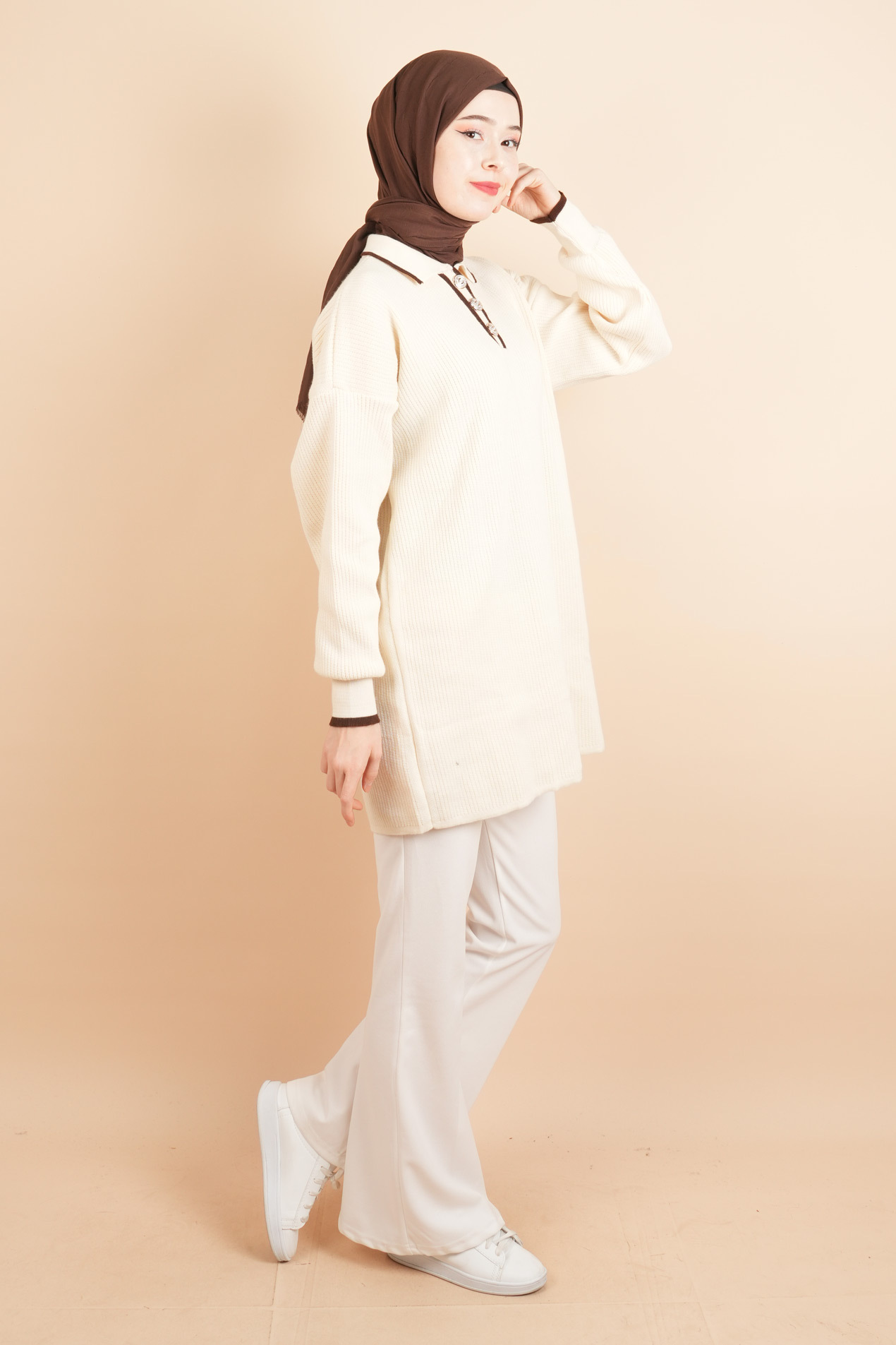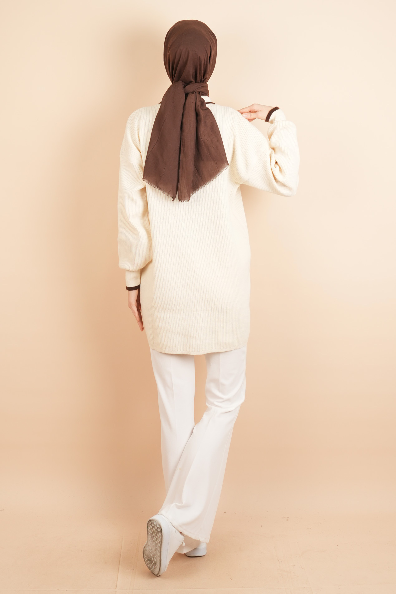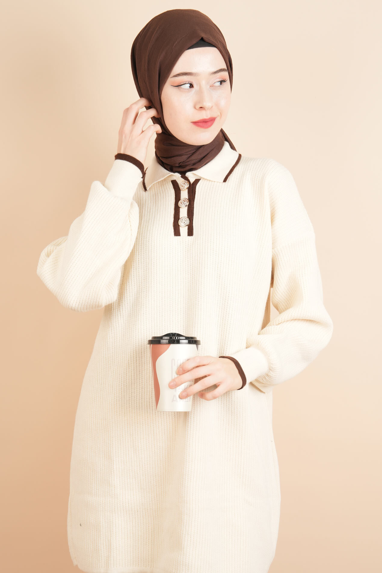Yaka Ve Düğme Detaylı Tesettür Tunik Kazak Krem
