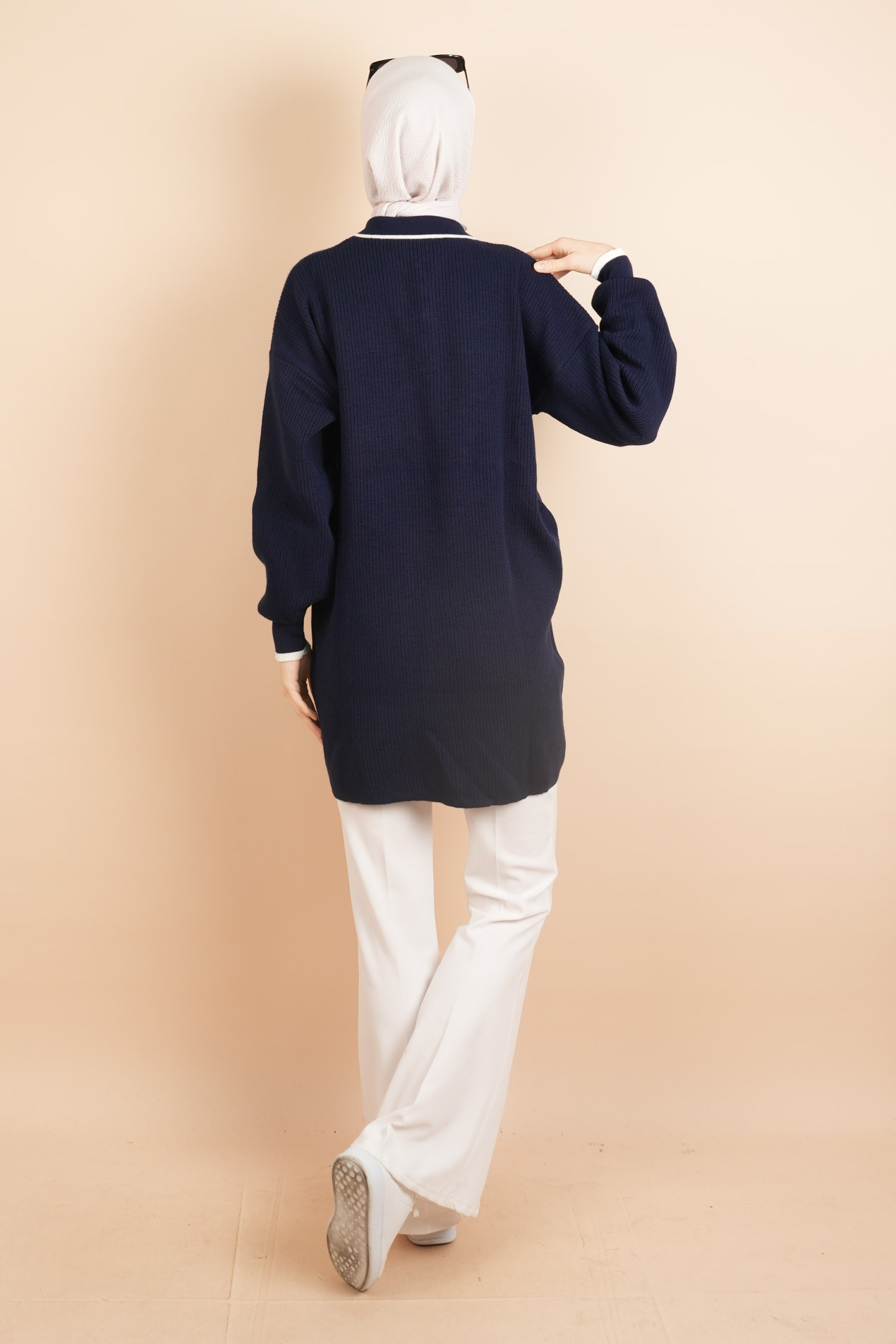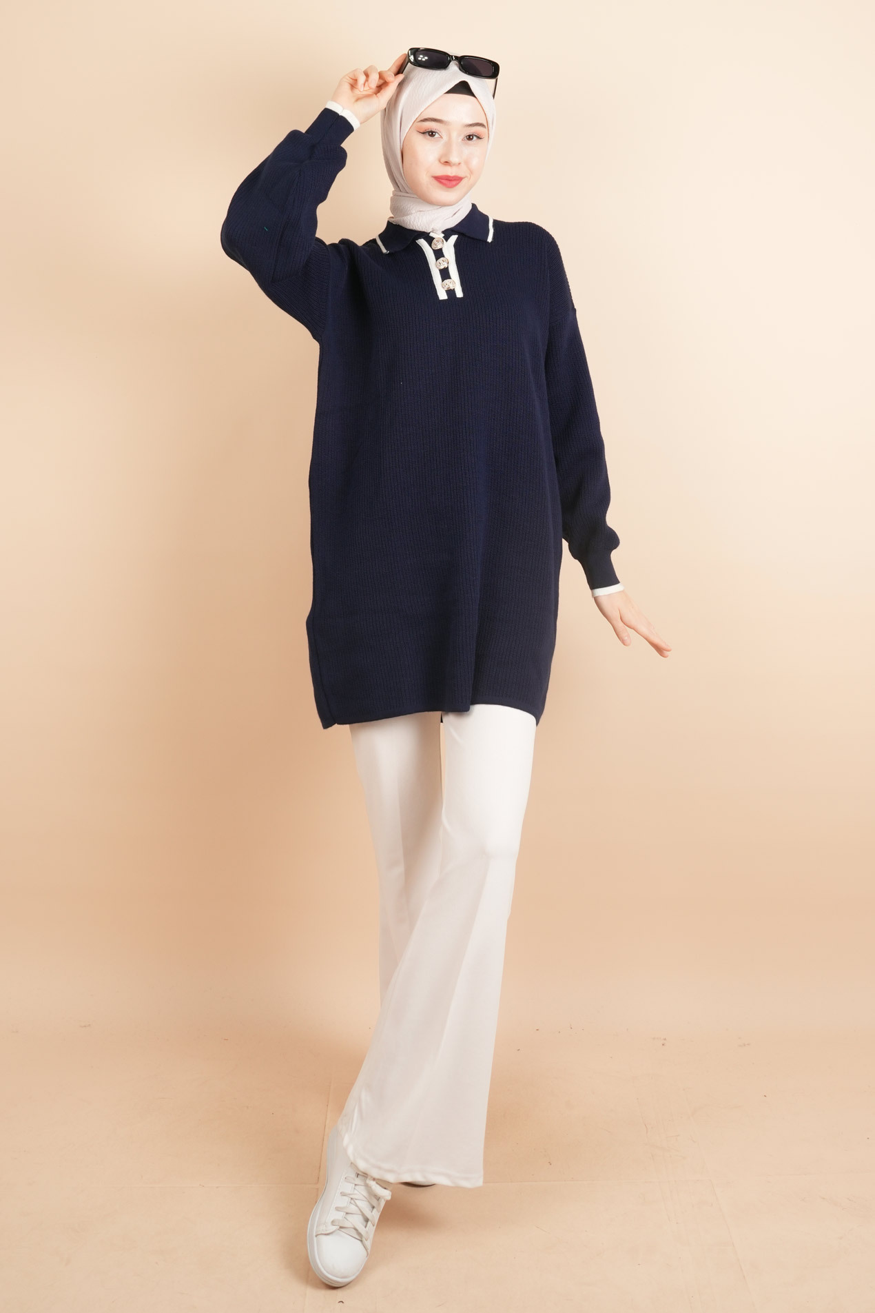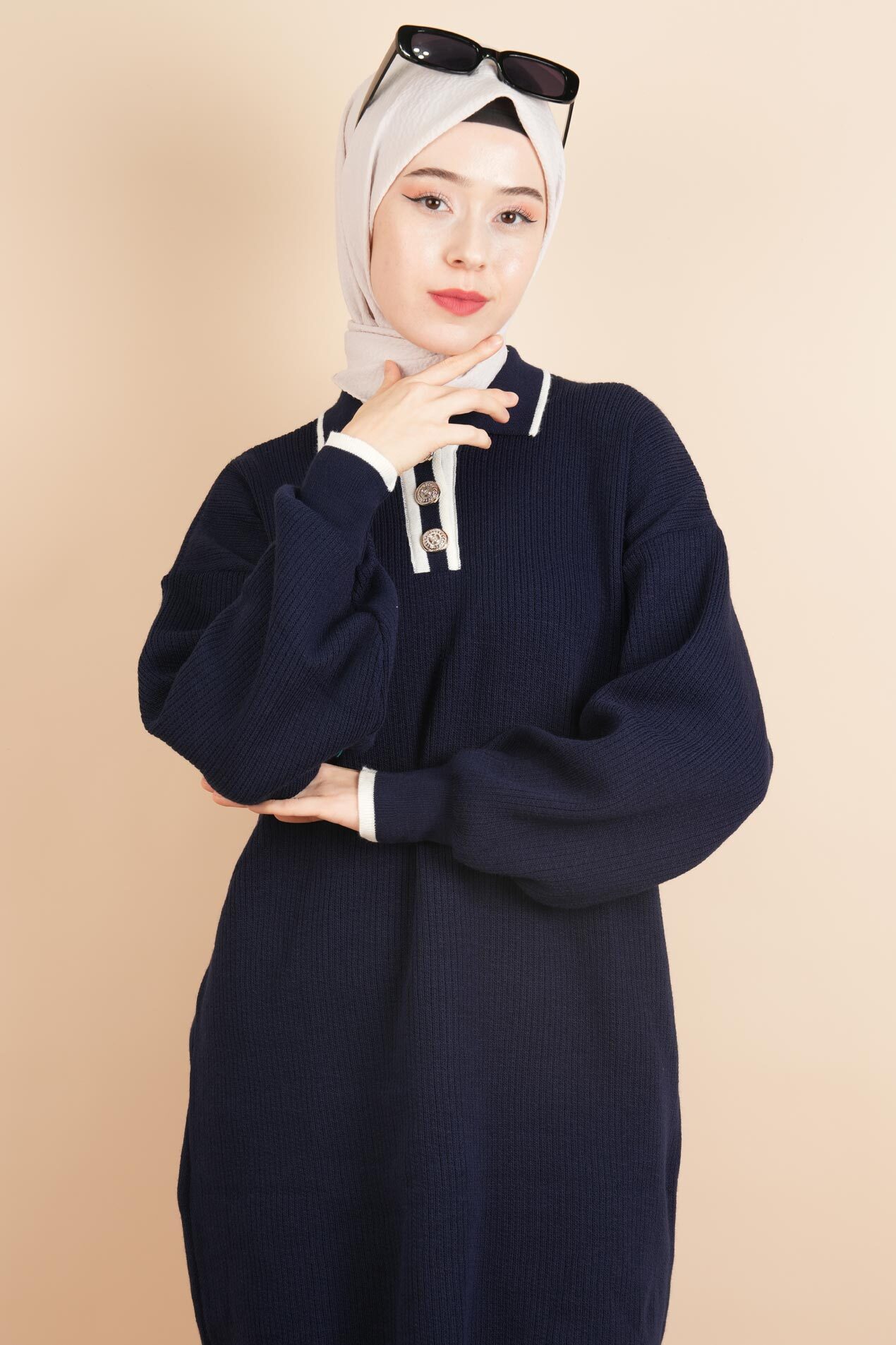 Yaka Ve Düğme Detaylı Tesettür Tunik Kazak Lacivert