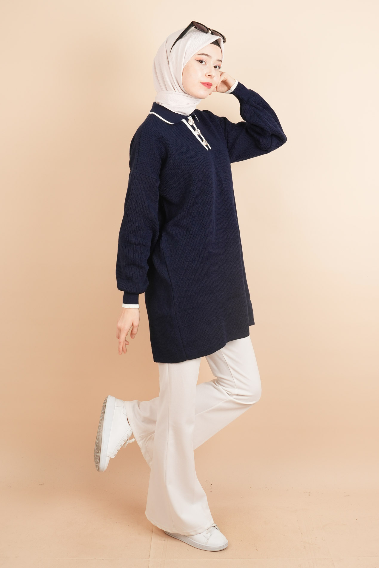 Yaka ve düğme detaylı tesettür tunik kazak, şıklığı ve zarafeti bir arada sunarak günlük kombinlerinizi tamamlar. Yaka kısmındaki düğme detayı, modern bir görünüm kazandırırken, rahat kesimi ile konfor sağlar. Farklı renk seçenekleriyle her mevsim rahatlıkla tercih edilebilir.