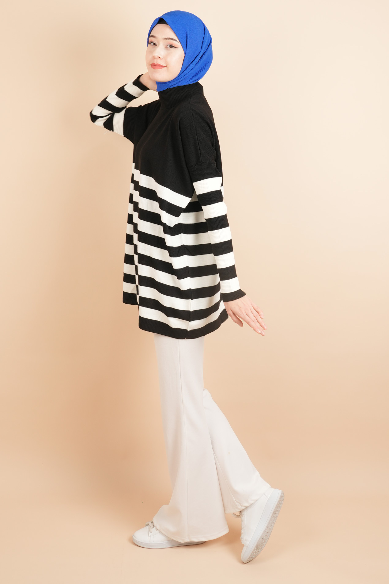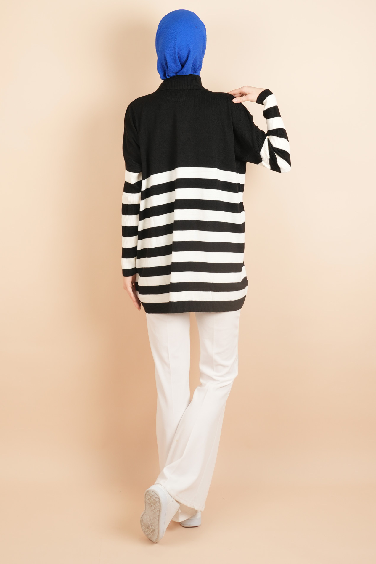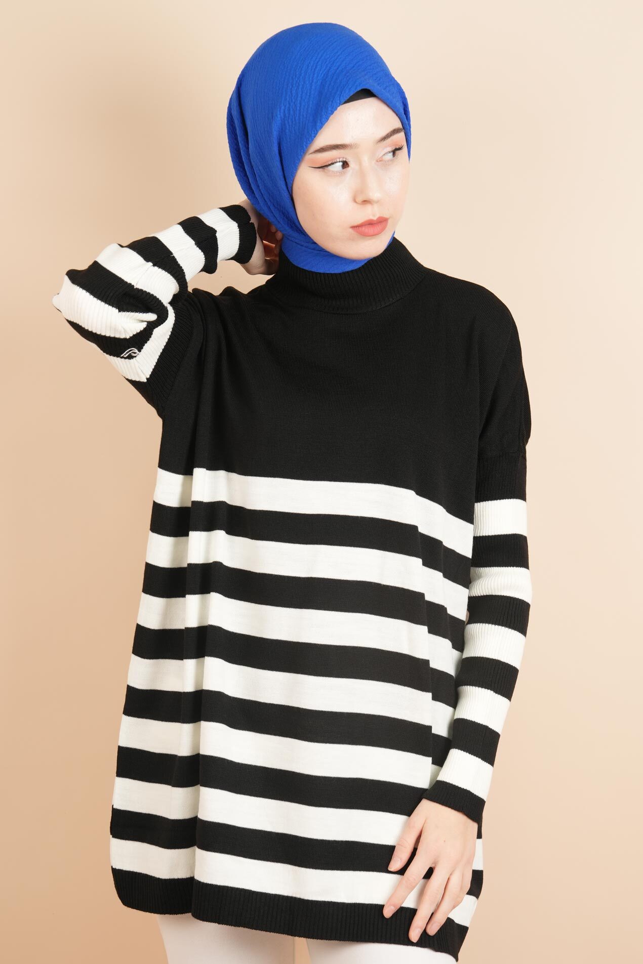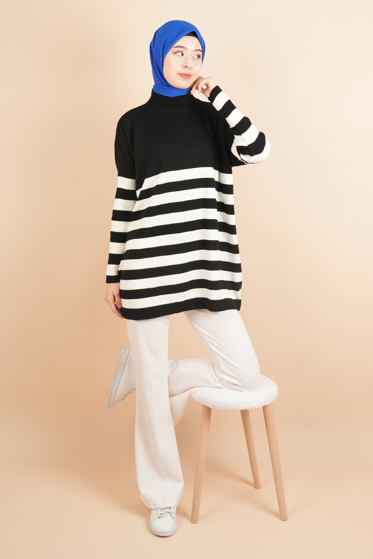 Yarım Balıkçı Yaka Tesettür Çizgili Tunik Kazak Siyah