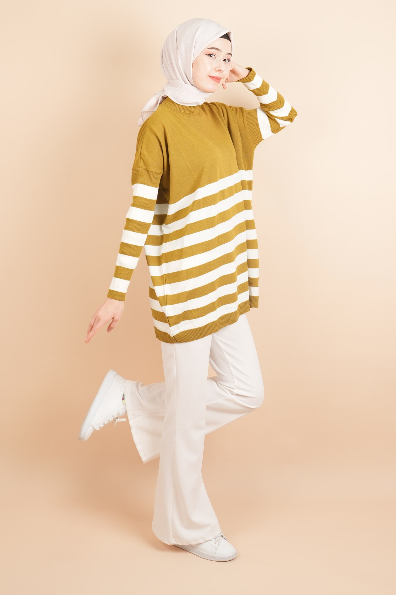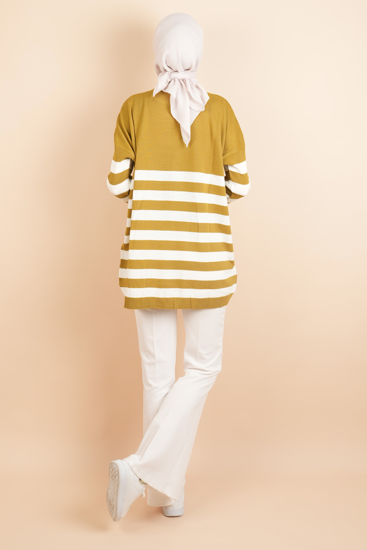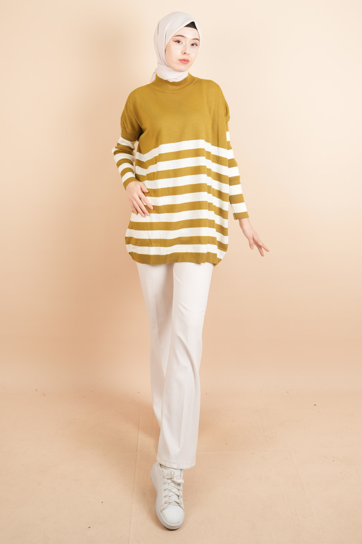 Yarım Balıkçı Yaka Tesettür Çizgili Tunik Kazak Yağ Yeşili