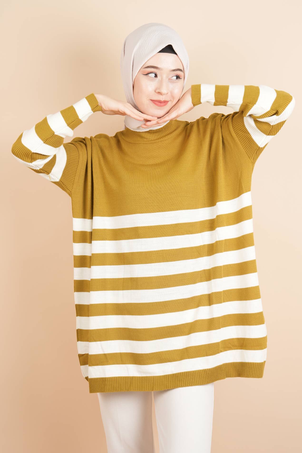 Yarım Balıkçı Yaka Tesettür Çizgili Tunik Kazak, şık çizgili deseni ve modern yarım balıkçı yaka detayıyla rahatlık sunar. Günlük kullanıma uygun, tesettür modasında zarif ve konforlu bir parça.