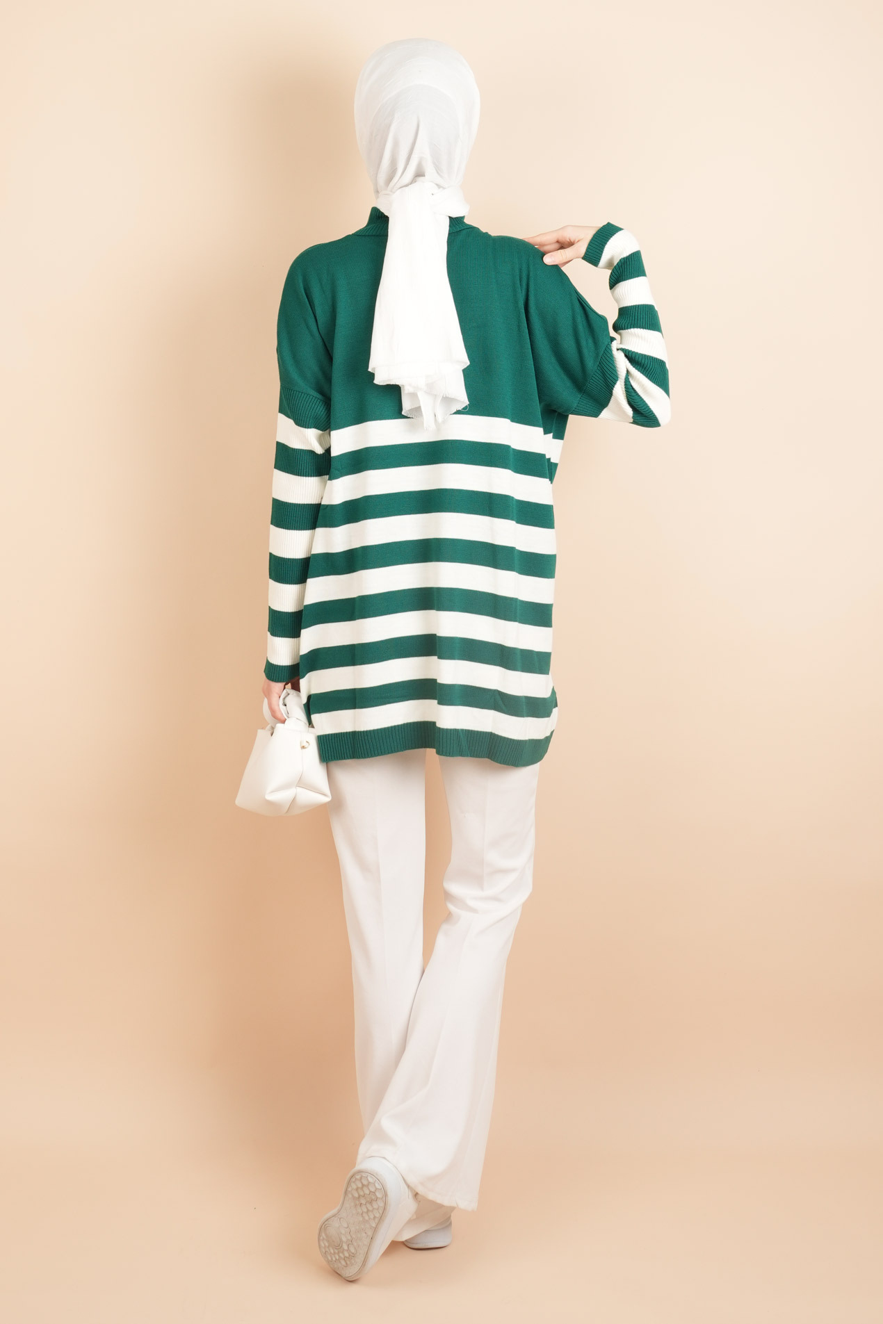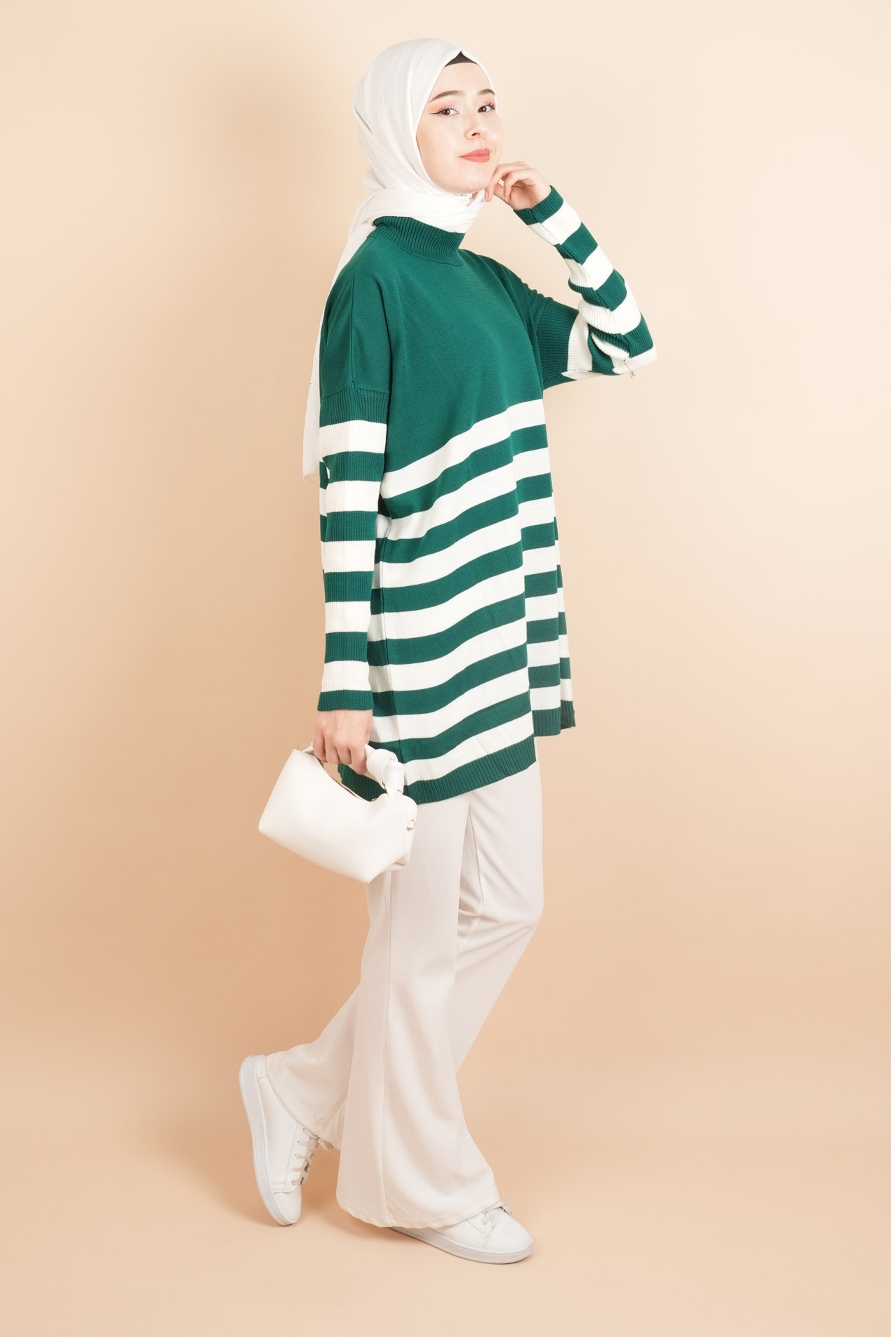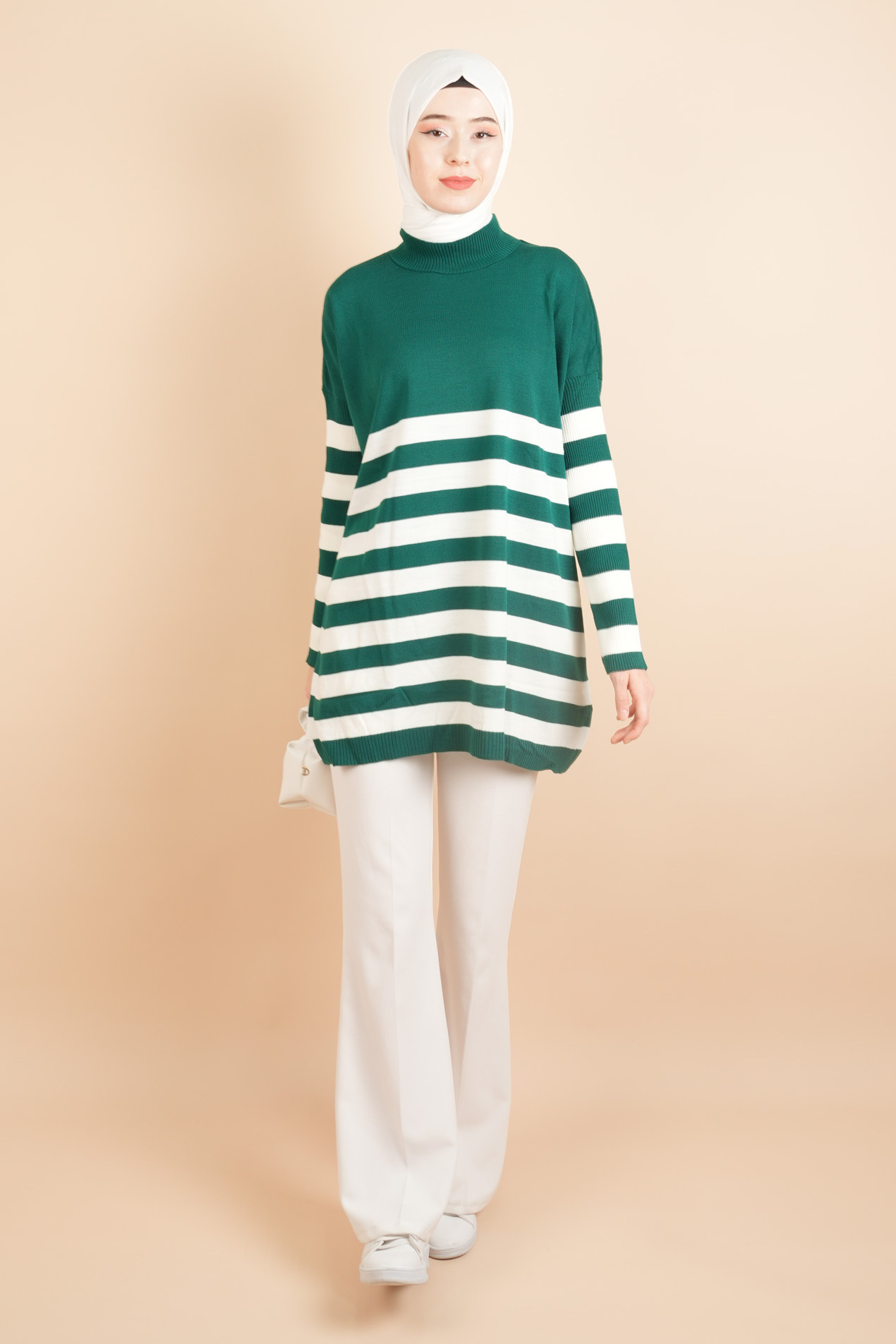 Yarım Balıkçı Yaka Tesettür Çizgili Tunik Kazak, şık çizgili deseni ve modern yarım balıkçı yaka detayıyla rahatlık sunar. Günlük kullanıma uygun, tesettür modasında zarif ve konforlu bir parça.