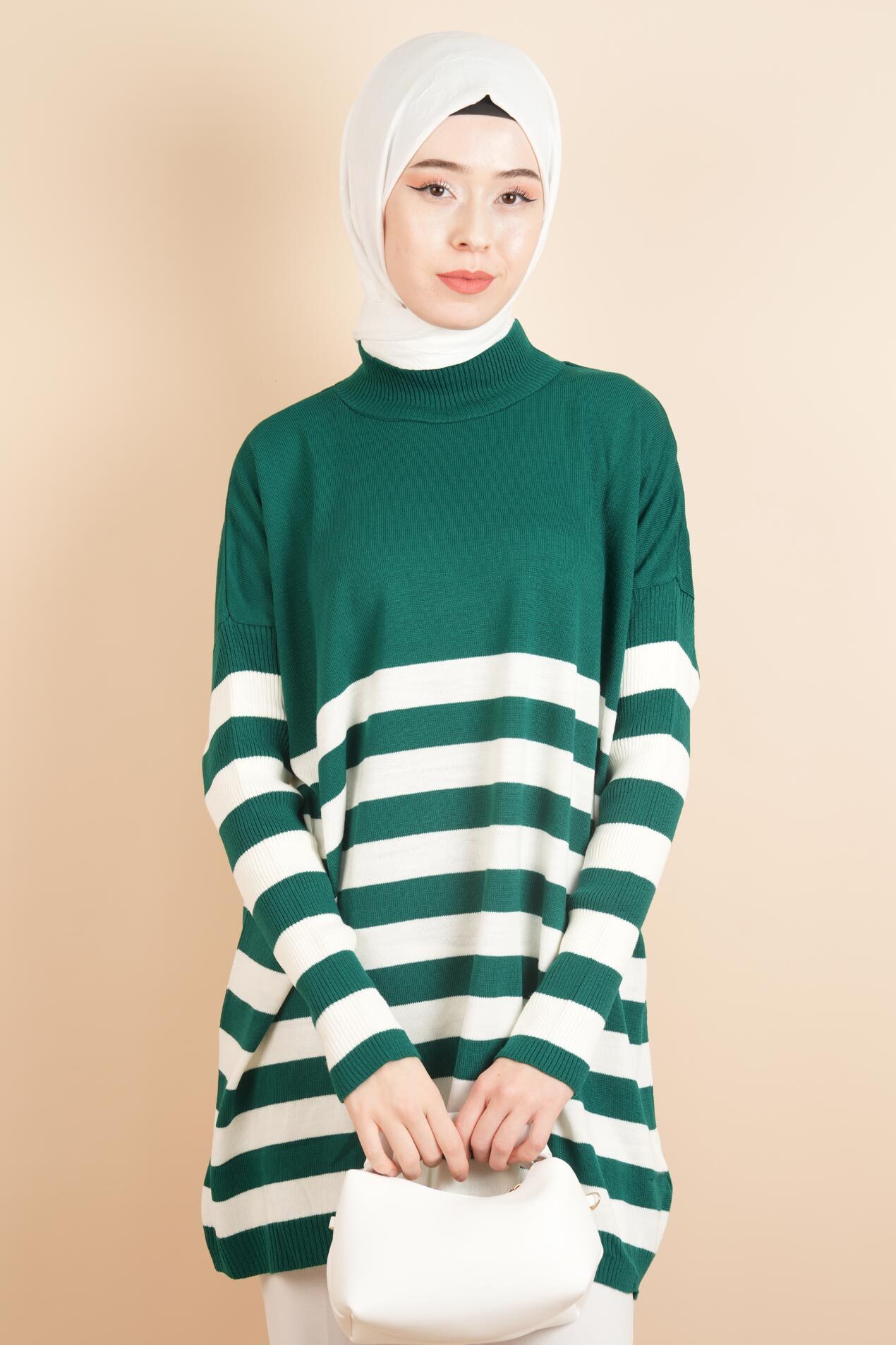 Yarım Balıkçı Yaka Tesettür Çizgili Tunik Kazak Zümrüt