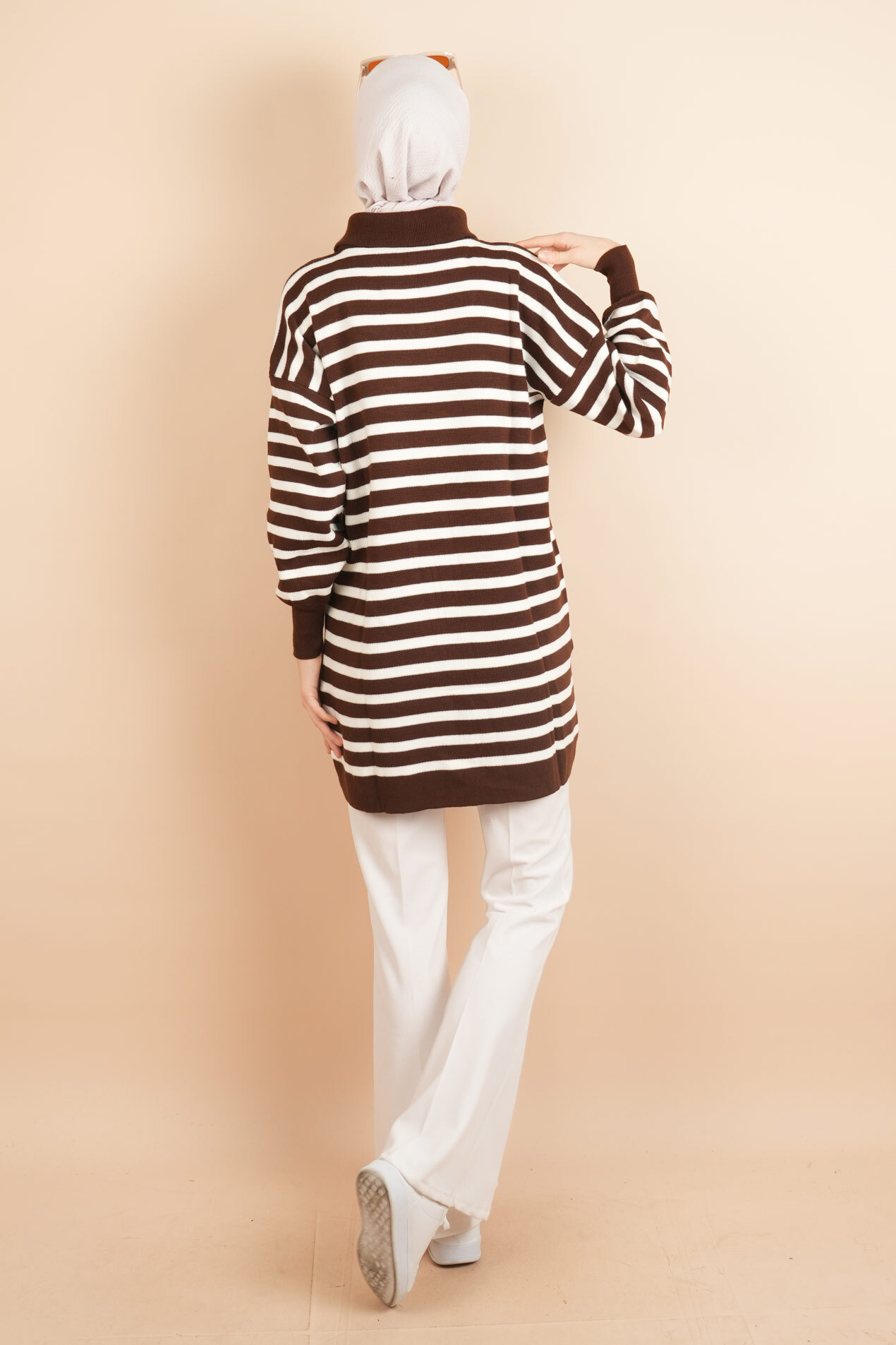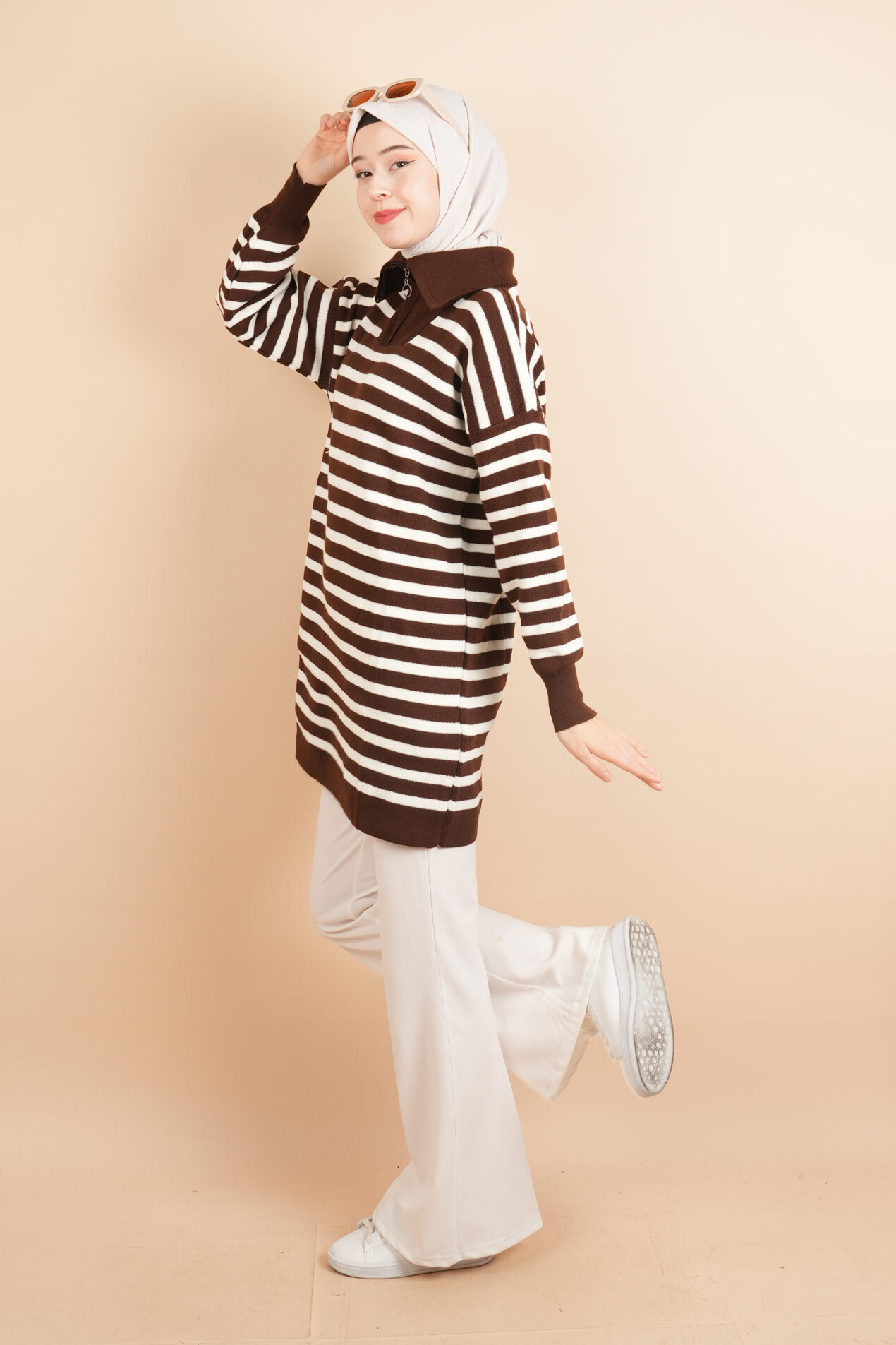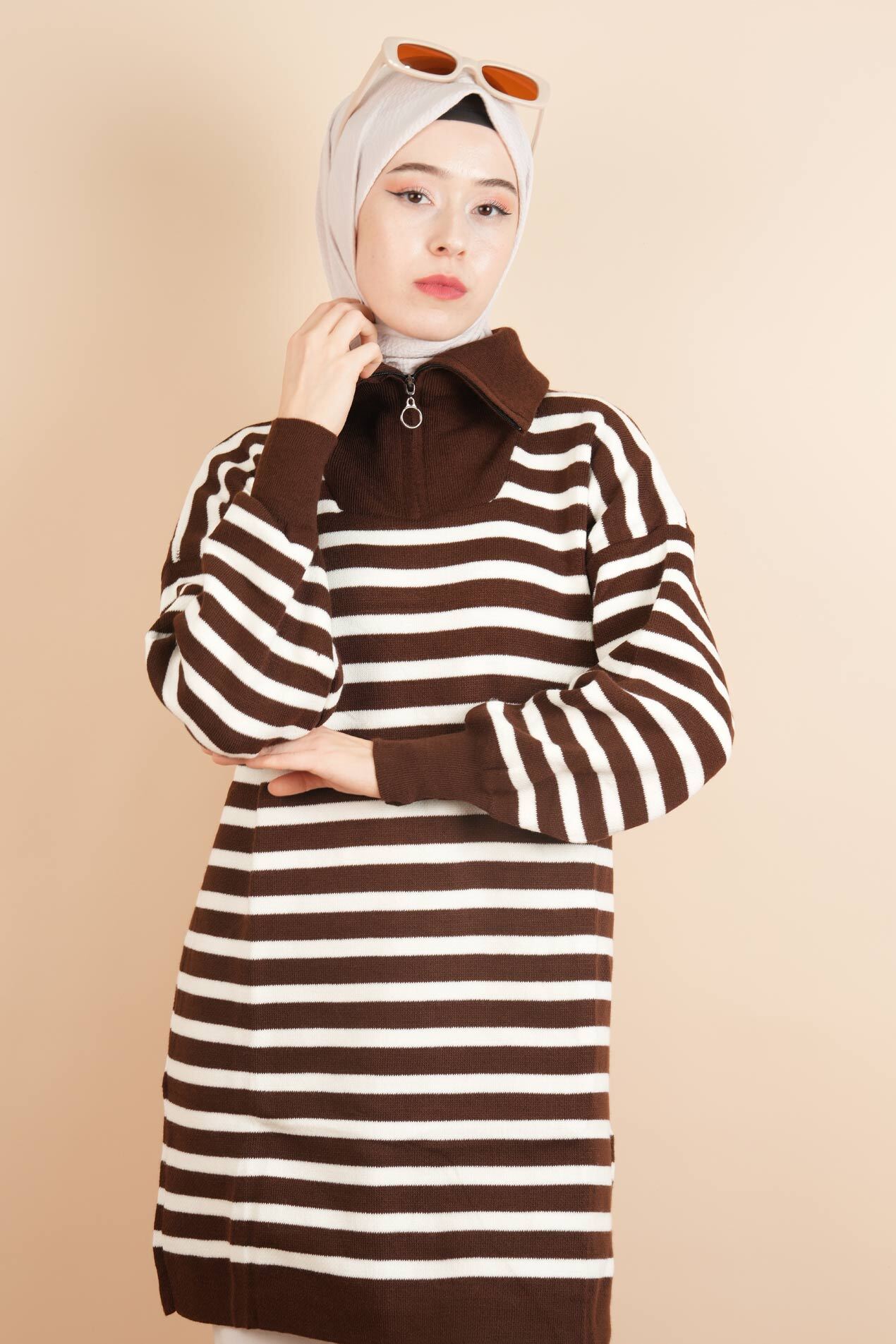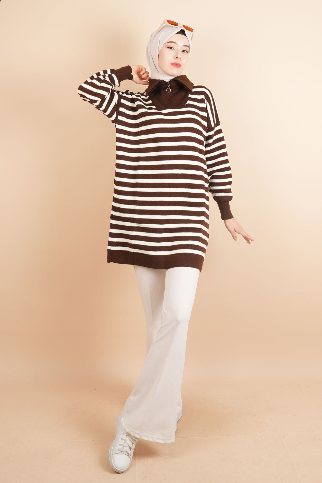 Yarım fermuar full ince çizgili tesettür tunik kazak, zarif ve modern bir görünüm sunar. İnce çizgi detayı, şıklığınıza sofistike bir dokunuş katar. Yarım fermuar özelliği, rahat bir giyim deneyimi sağlar. Hafif kumaşı sayesinde hem günlük kullanımda hem de özel günlerde konforla tercih edilebilir. Farklı renk seçenekleriyle her tarza uyum sağlayan bu tunik, gardırobunuzun vazgeçilmez parçası olacak.