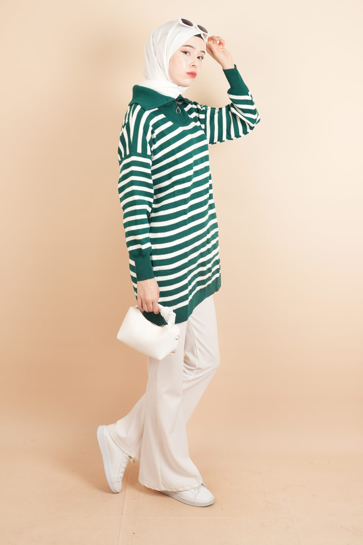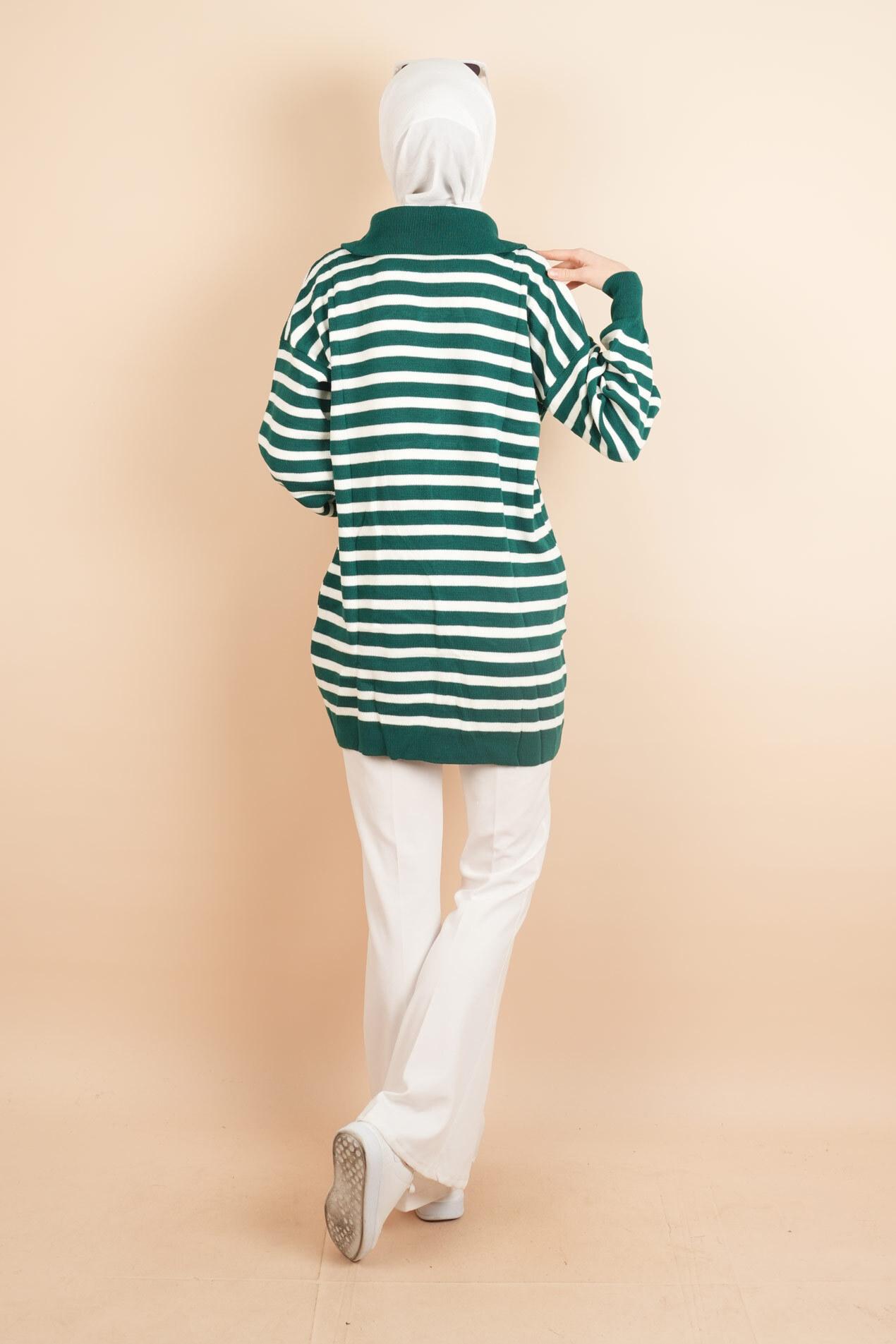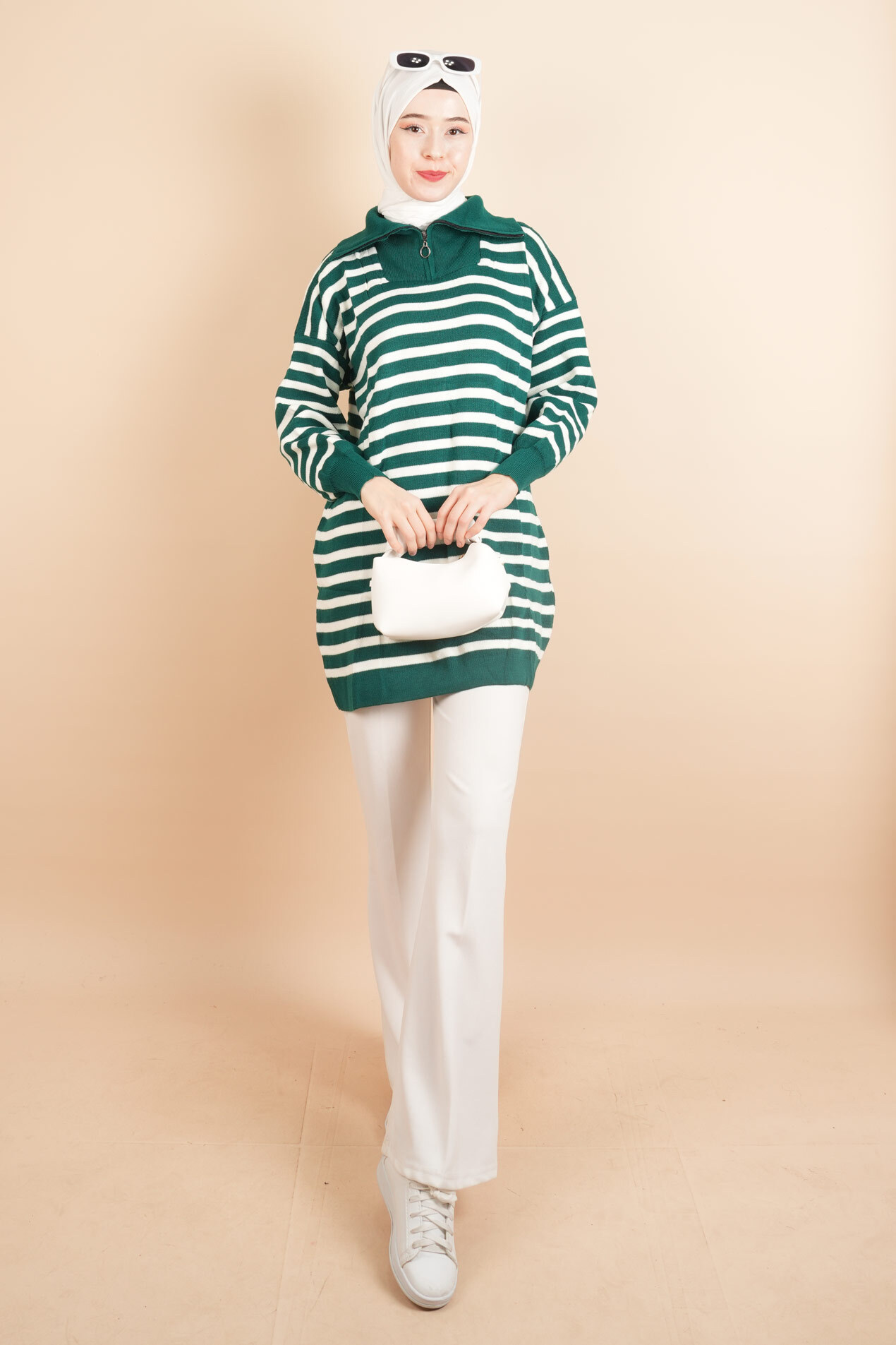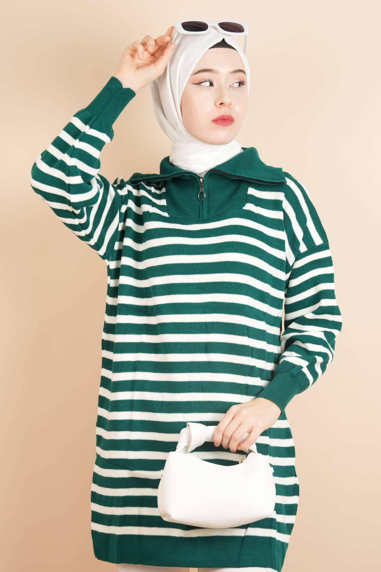 Yarım fermuar full ince çizgili tesettür tunik kazak, zarif ve modern bir görünüm sunar. İnce çizgi detayı, şıklığınıza sofistike bir dokunuş katar. Yarım fermuar özelliği, rahat bir giyim deneyimi sağlar. Hafif kumaşı sayesinde hem günlük kullanımda hem de özel günlerde konforla tercih edilebilir. Farklı renk seçenekleriyle her tarza uyum sağlayan bu tunik, gardırobunuzun vazgeçilmez parçası olacak.