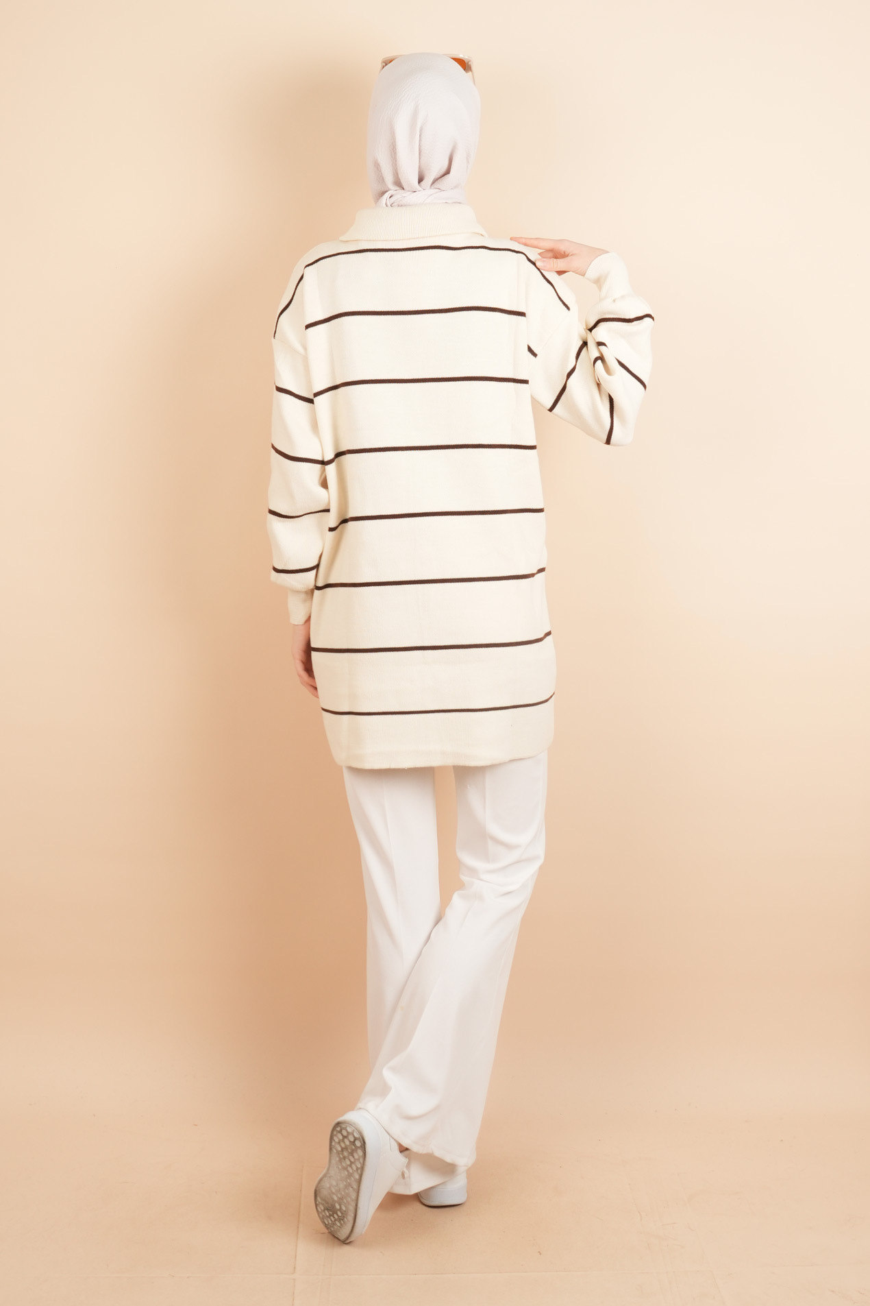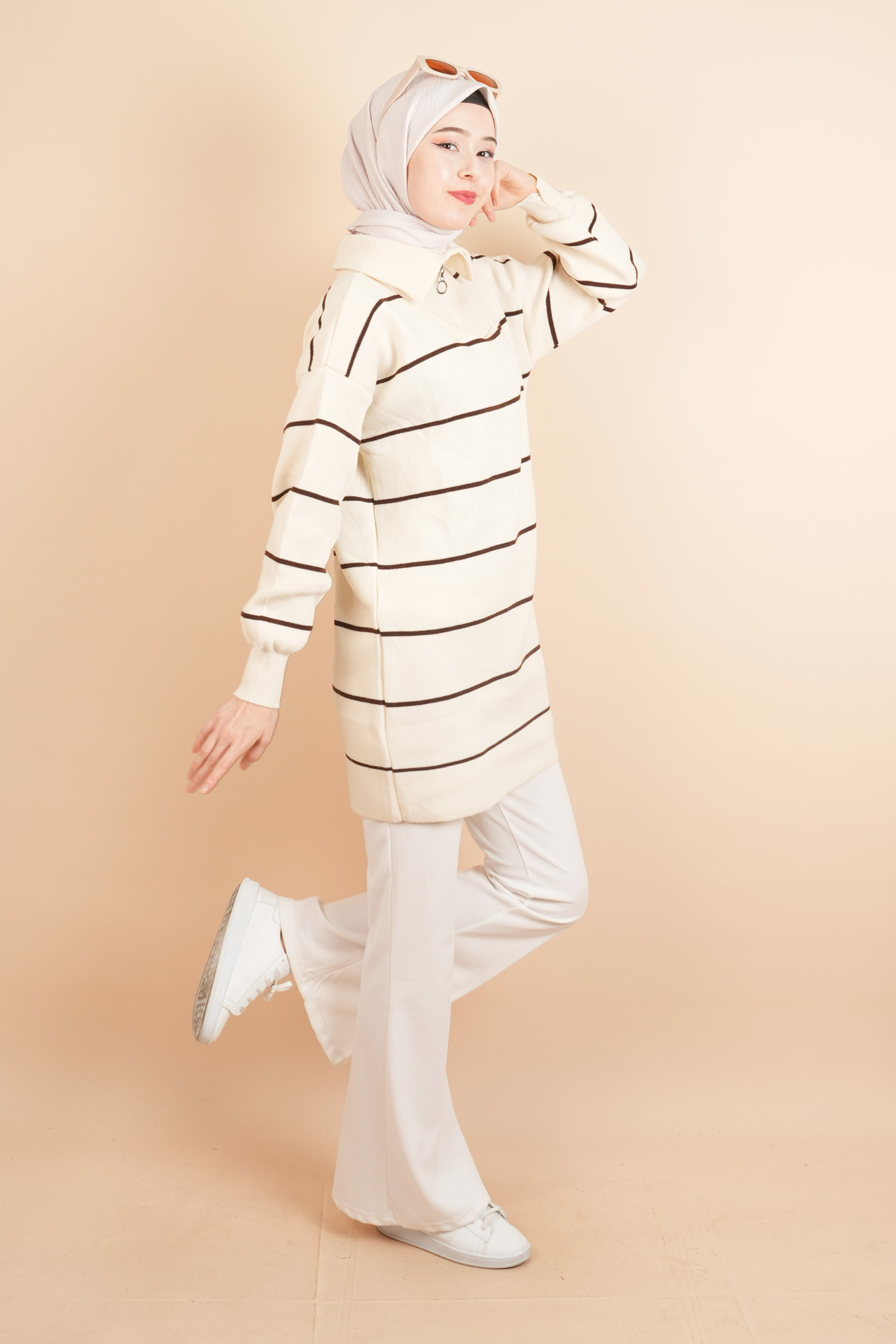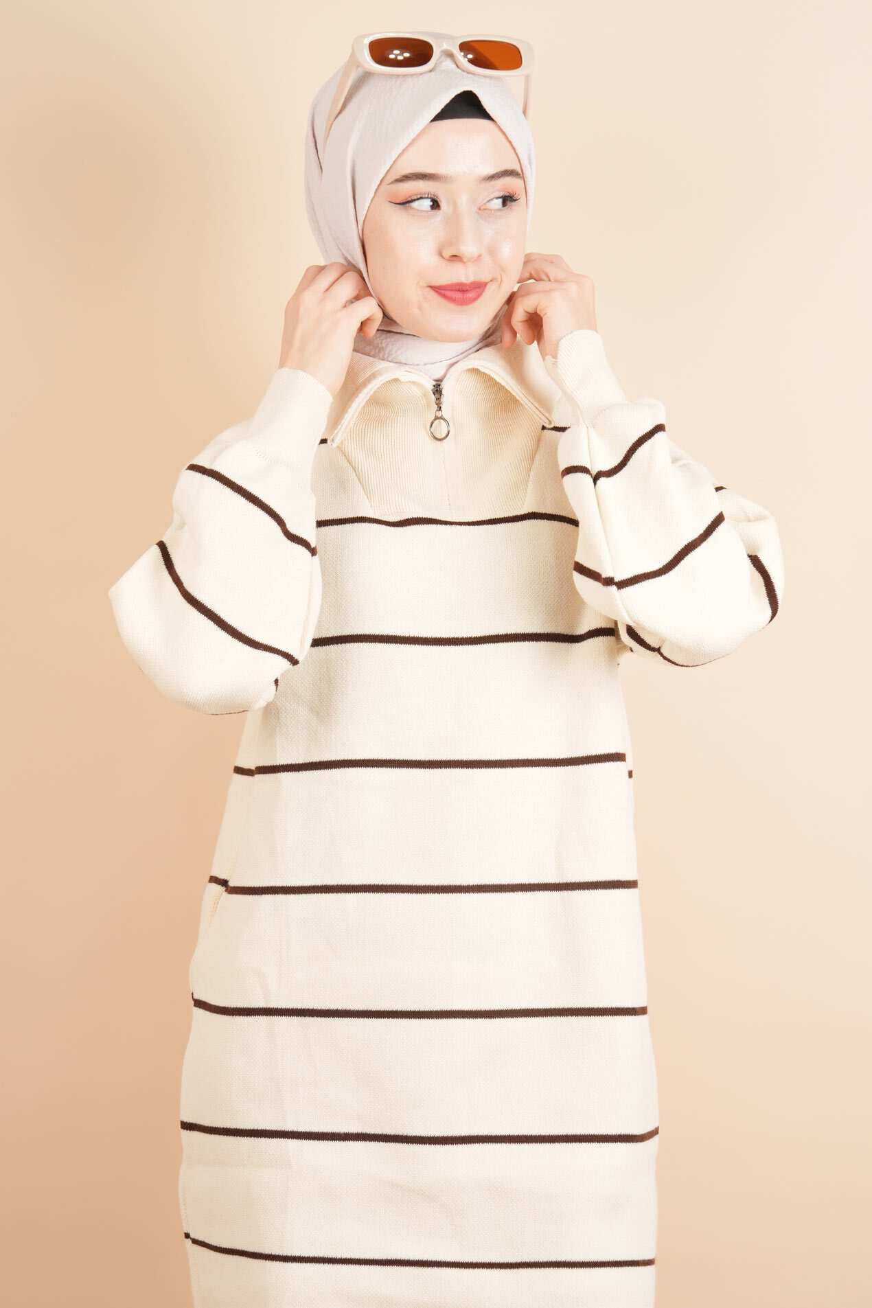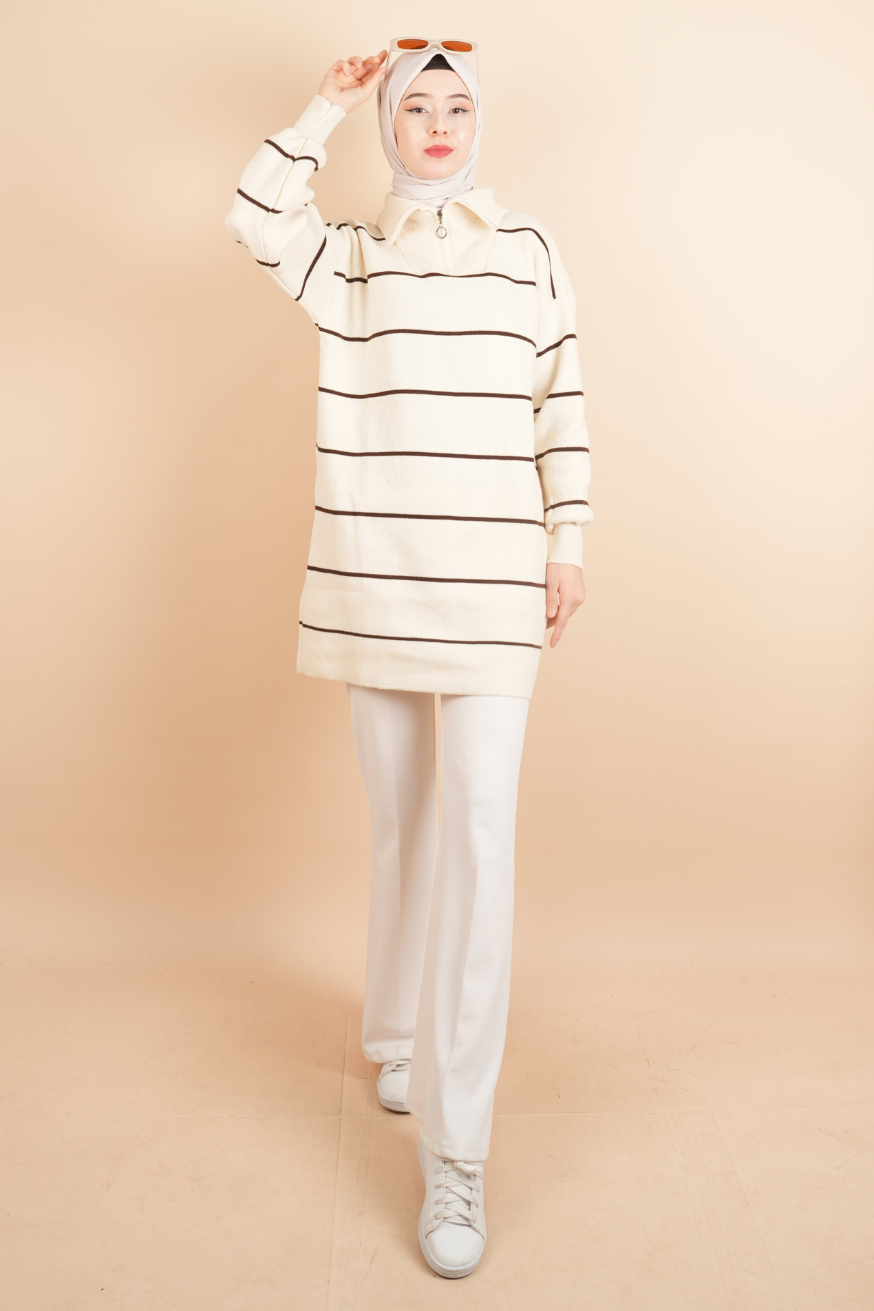 Yarım Fermuarlı Kalın Aralıklı Çizgili Tunik Kazak Krem