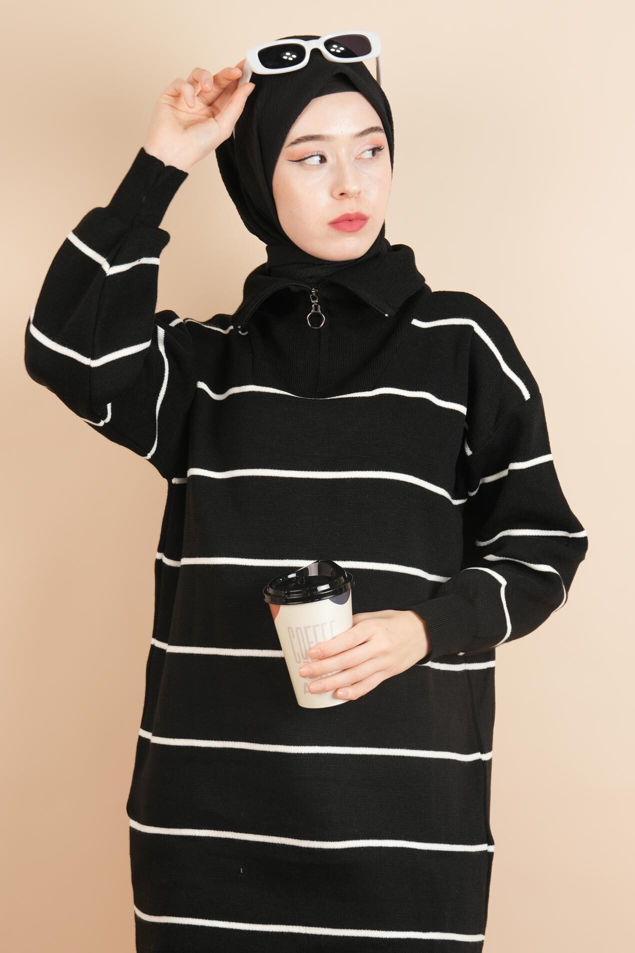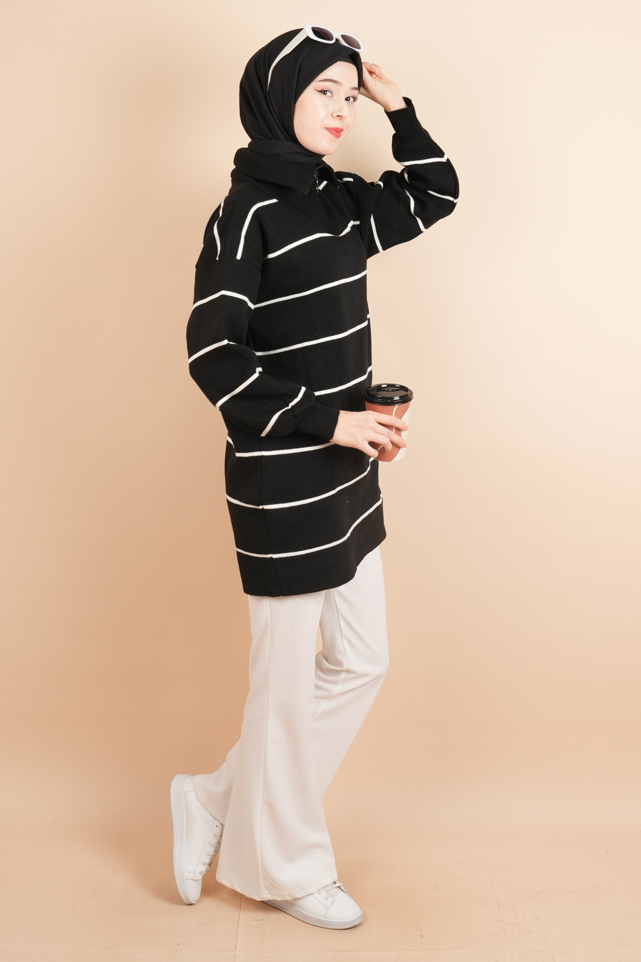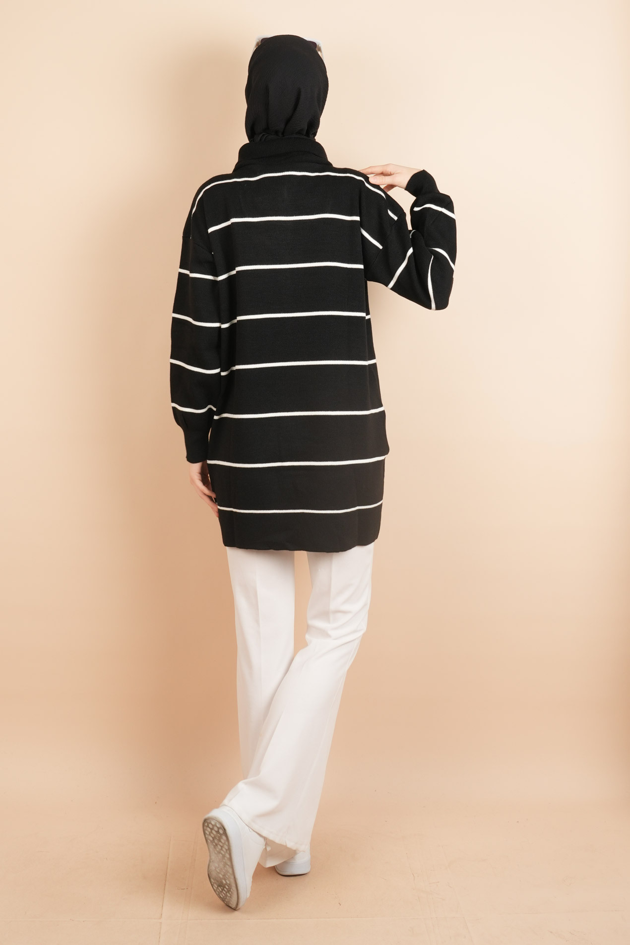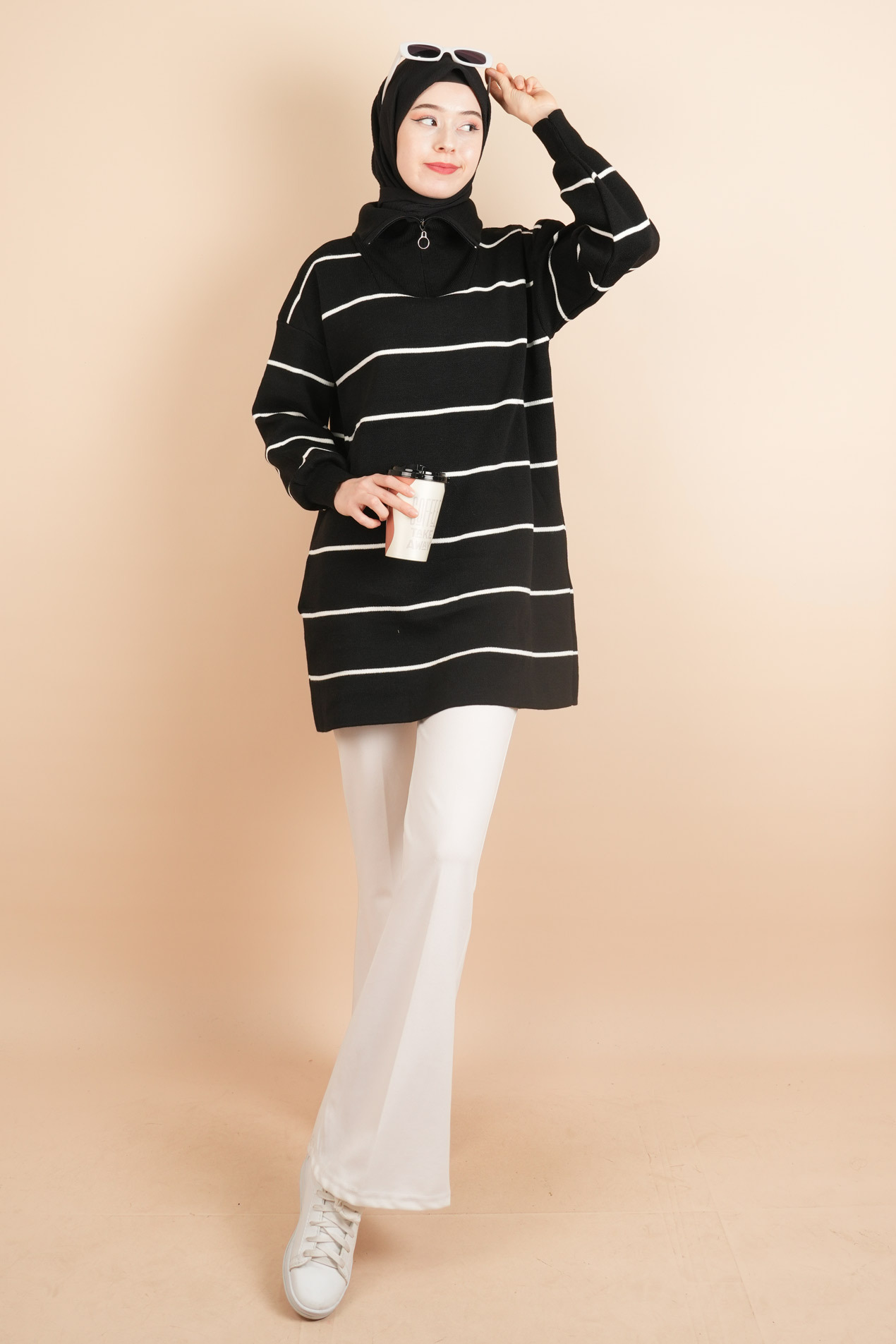 Yarım Fermuarlı Kalın Aralıklı Çizgili Tunik Kazak Siyah
