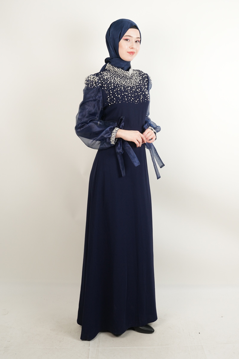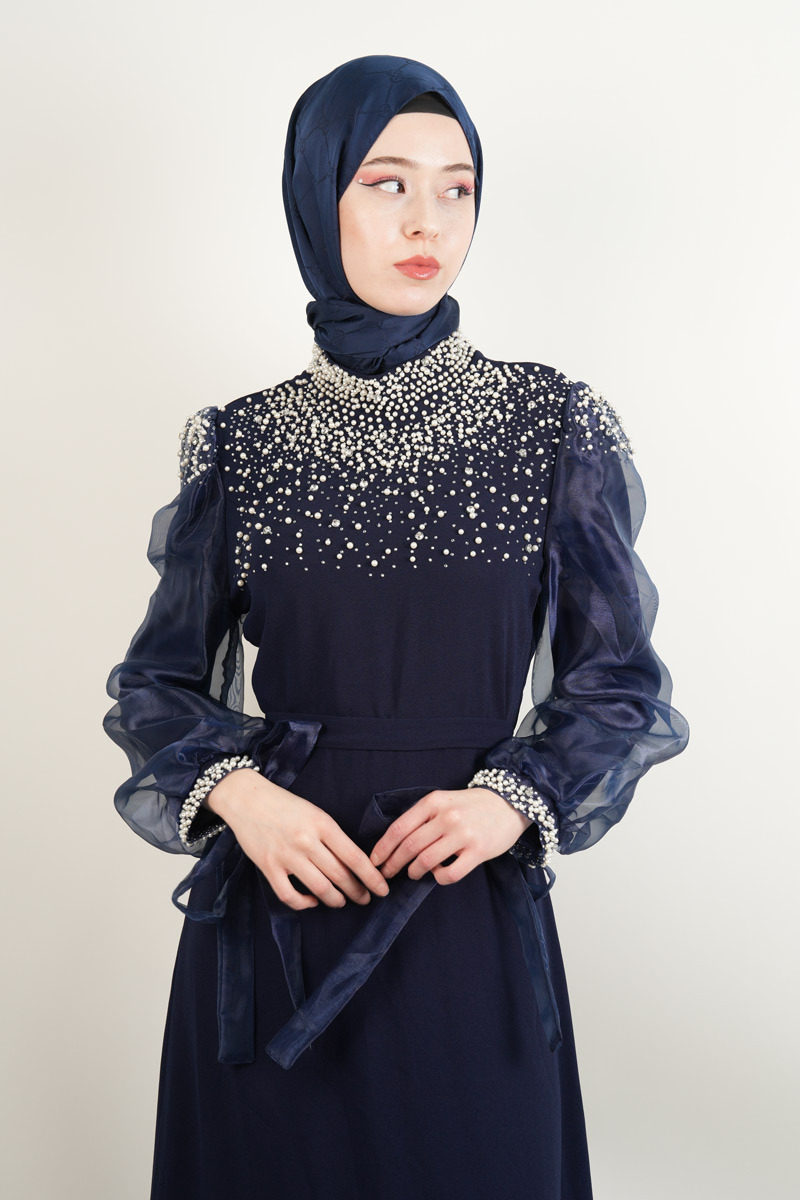 Lacivert tonlarında zarif bir abiye, inci detayları ve tül kol tasarımıyla etkileyici bir şıklık sağlıyor.